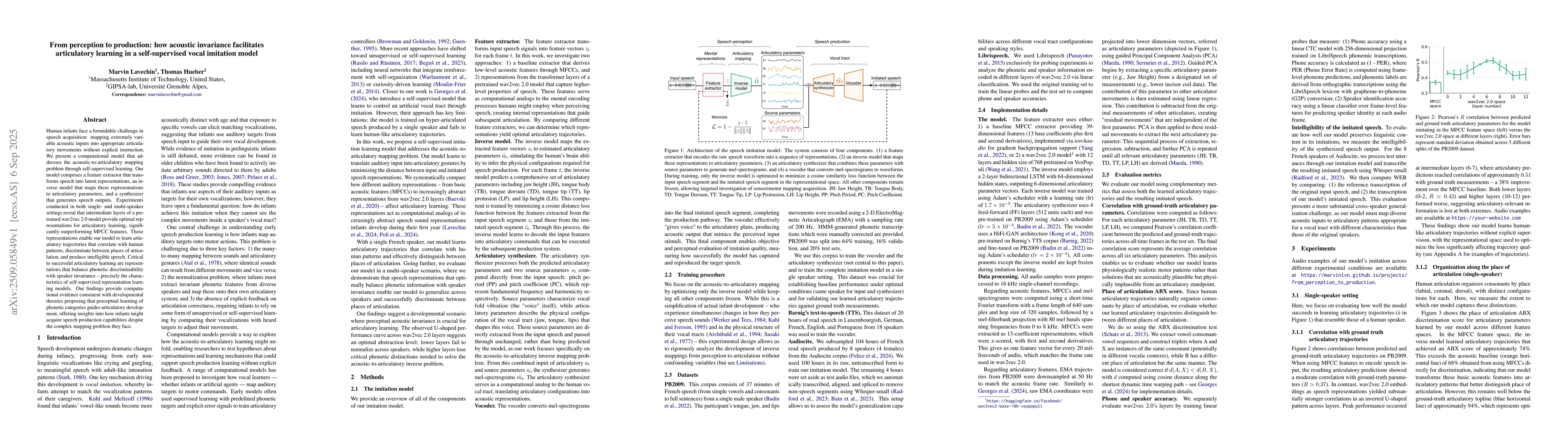 Human infants face a formidable challenge in speech acquisition: mapping extremely variable acoustic inputs into appropriate articulatory movements without explicit instruction. We present a computational model that addresses the acoustic-to-articulatory mapping problem through self-supervised learning. Our model comprises a feature extractor that transforms speech into latent representations, an inverse model that maps these representations to articulatory parameters, and a synthesizer that generates speech outputs. Experiments conducted in both single- and multi-speaker settings reveal that intermediate layers of a pre-trained wav2vec 2.0 model provide optimal representations for articulatory learning, significantly outperforming MFCC features. These representations enable our model to learn articulatory trajectories that correlate with human patterns, discriminate between places of articulation, and produce intelligible speech. Critical to successful articulatory learning are representations that balance phonetic discriminability with speaker invariance -- precisely the characteristics of self-supervised representation learning models. Our findings provide computational evidence consistent with developmental theories proposing that perceptual learning of phonetic categories guides articulatory development, offering insights into how infants might acquire speech production capabilities despite the complex mapping problem they face.