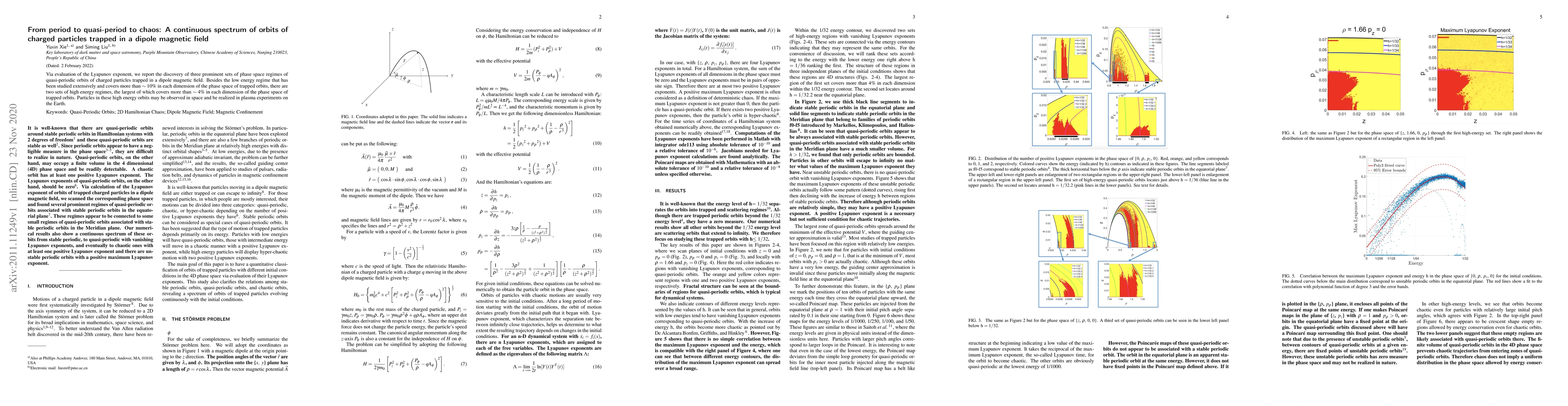 This paper identifies three distinct phase space regimes of quasi-periodic orbits for charged particles in a dipole magnetic field, using the Lyapunov exponent. It reveals a continuous spectrum from stable periodic to quasi-periodic orbits, and finally to chaotic orbits, with quasi-periodic orbits being more detectable in nature.
