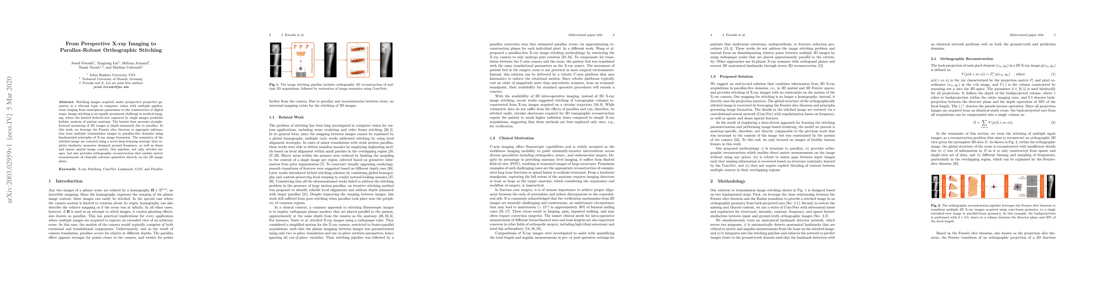 Stitching images acquired under perspective projective geometry is a relevant topic in computer vision with multiple applications ranging from smartphone panoramas to the construction of digital maps. Image stitching is an equally prominent challenge in medical imaging, where the limited field-of-view captured by single images prohibits holistic analysis of patient anatomy. The barrier that prevents straight-forward mosaicing of 2D images is depth mismatch due to parallax. In this work, we leverage the Fourier slice theorem to aggregate information from multiple transmission images in parallax-free domains using fundamental principles of X-ray image formation. The semantics of the stitched image are restored using a novel deep learning strategy that exploits similarity measures designed around frequency, as well as dense and sparse spatial image content. Our pipeline, not only stitches images, but also provides orthographic reconstruction that enables metric measurements of clinically relevant quantities directly on the 2D image plane.