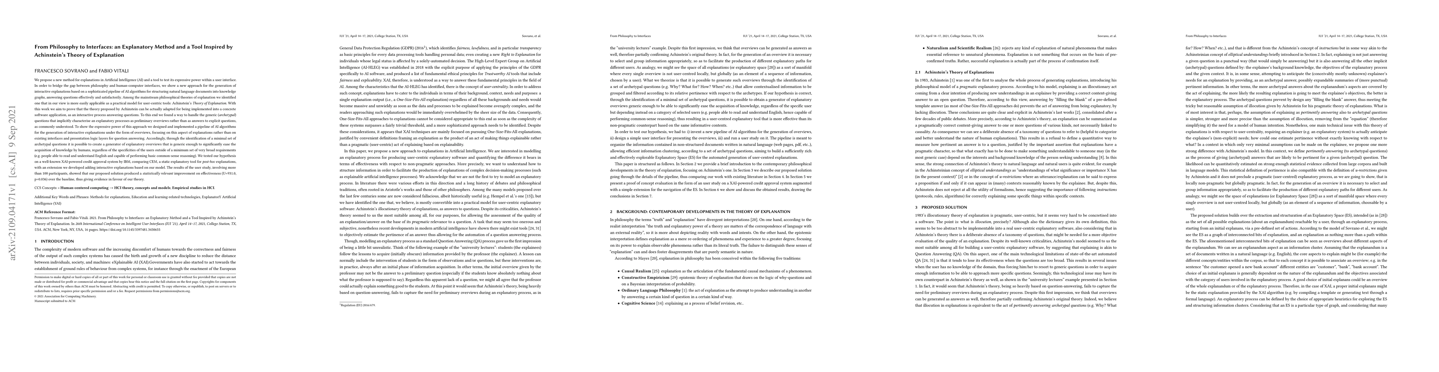 We propose a new method for explanations in Artificial Intelligence (AI) and a tool to test its expressive power within a user interface. In order to bridge the gap between philosophy and human-computer interfaces, we show a new approach for the generation of interactive explanations based on a sophisticated pipeline of AI algorithms for structuring natural language documents into knowledge graphs, answering questions effectively and satisfactorily. Among the mainstream philosophical theories of explanation we identified one that in our view is more easily applicable as a practical model for user-centric tools: Achinstein's Theory of Explanation. With this work we aim to prove that the theory proposed by Achinstein can be actually adapted for being implemented into a concrete software application, as an interactive process answering questions. To this end we found a way to handle the generic (archetypal) questions that implicitly characterise an explanatory processes as preliminary overviews rather than as answers to explicit questions, as commonly understood. To show the expressive power of this approach we designed and implemented a pipeline of AI algorithms for the generation of interactive explanations under the form of overviews, focusing on this aspect of explanations rather than on existing interfaces and presentation logic layers for question answering. We tested our hypothesis on a well-known XAI-powered credit approval system by IBM, comparing CEM, a static explanatory tool for post-hoc explanations, with an extension we developed adding interactive explanations based on our model. The results of the user study, involving more than 100 participants, showed that our proposed solution produced a statistically relevant improvement on effectiveness (U=931.0, p=0.036) over the baseline, thus giving evidence in favour of our theory.