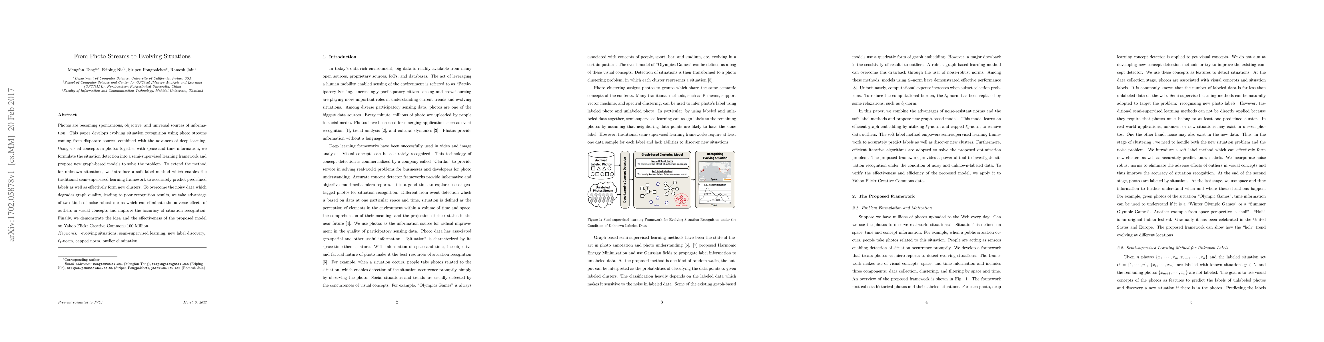 This research paper proposes a novel graph-based model for recognizing evolving situations from photo streams using deep learning and semi-supervised learning frameworks. It also introduces methods to handle noisy data and extend the method to unknown situations.