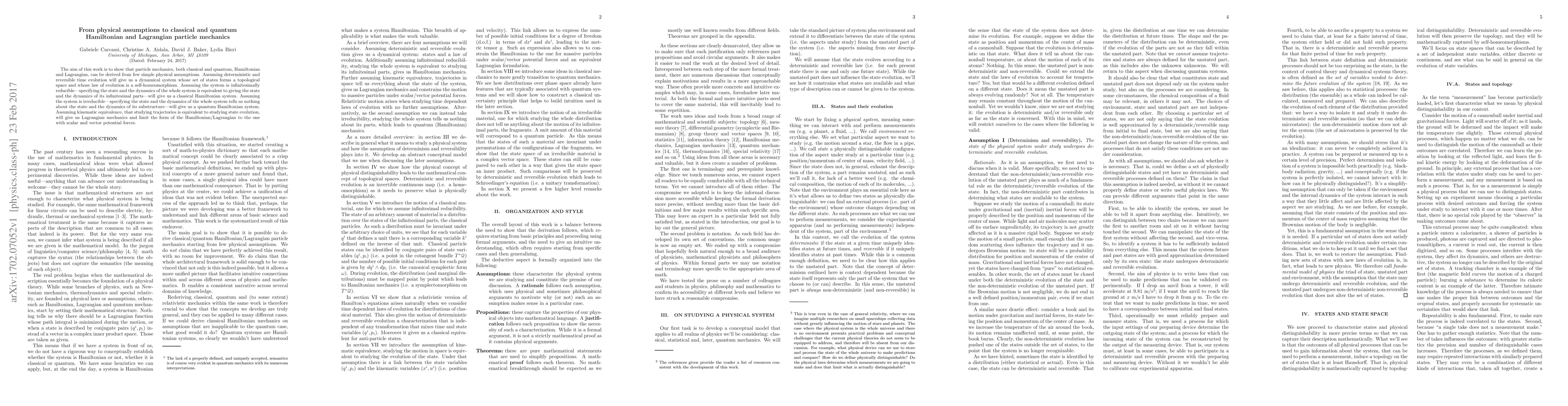 This paper derives classical and quantum Hamiltonian and Lagrangian particle mechanics from basic physical assumptions, showing that deterministic, reversible time evolution leads to a topological dynamical system, while infinitesimal reducibility yields classical mechanics and irreducibility leads to quantum mechanics. Kinematic equivalence further results in Lagrangian mechanics.