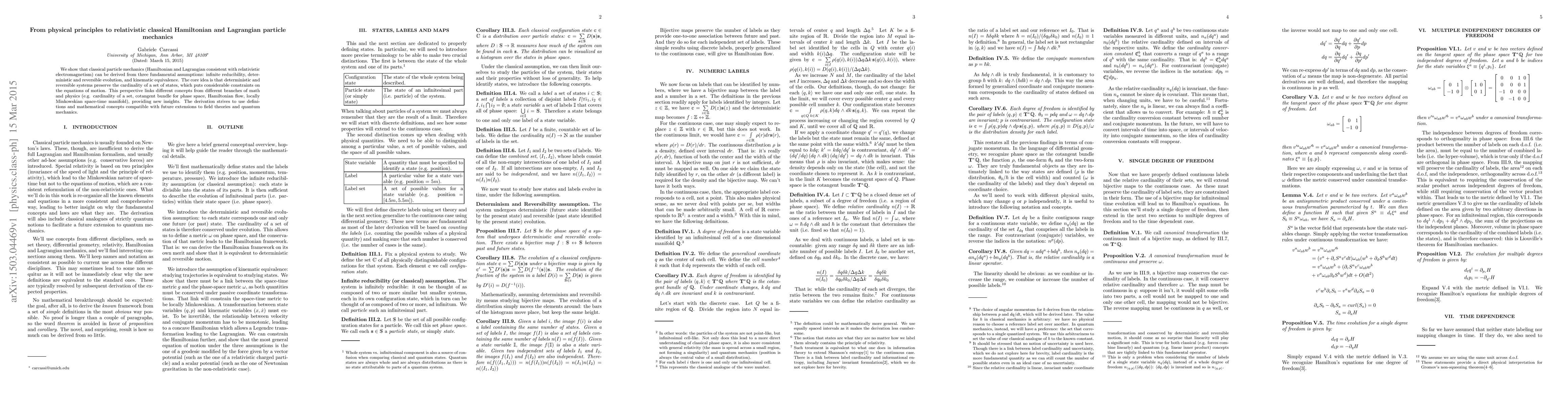 This paper derives relativistic classical Hamiltonian and Lagrangian particle mechanics from three fundamental assumptions: infinite reducibility, deterministic and reversible evolution, and kinematic equivalence. It highlights the preservation of state cardinality in deterministic systems, linking diverse mathematical and physical concepts to provide new insights and prepare for future extensions to field theories and quantum mechanics.