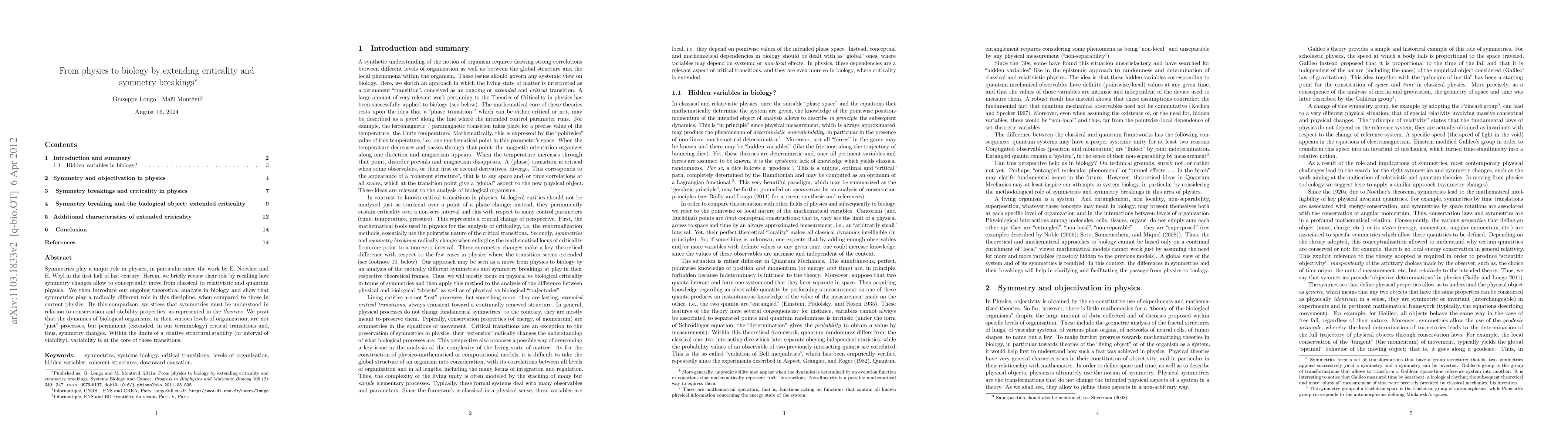 Symmetries play a major role in physics, in particular since the work by E. Noether and H. Weyl in the first half of last century. Herein, we briefly review their role by recalling how symmetry changes allow to conceptually move from classical to relativistic and quantum physics. We then introduce our ongoing theoretical analysis in biology and show that symmetries play a radically different role in this discipline, when compared to those in current physics. By this comparison, we stress that symmetries must be understood in relation to conservation and stability properties, as represented in the theories. We posit that the dynamics of biological organisms, in their various levels of organization, are not "just" processes, but permanent (extended, in our terminology) critical transitions and, thus, symmetry changes. Within the limits of a relative structural stability (or interval of viability), variability is at the core of these transitions.