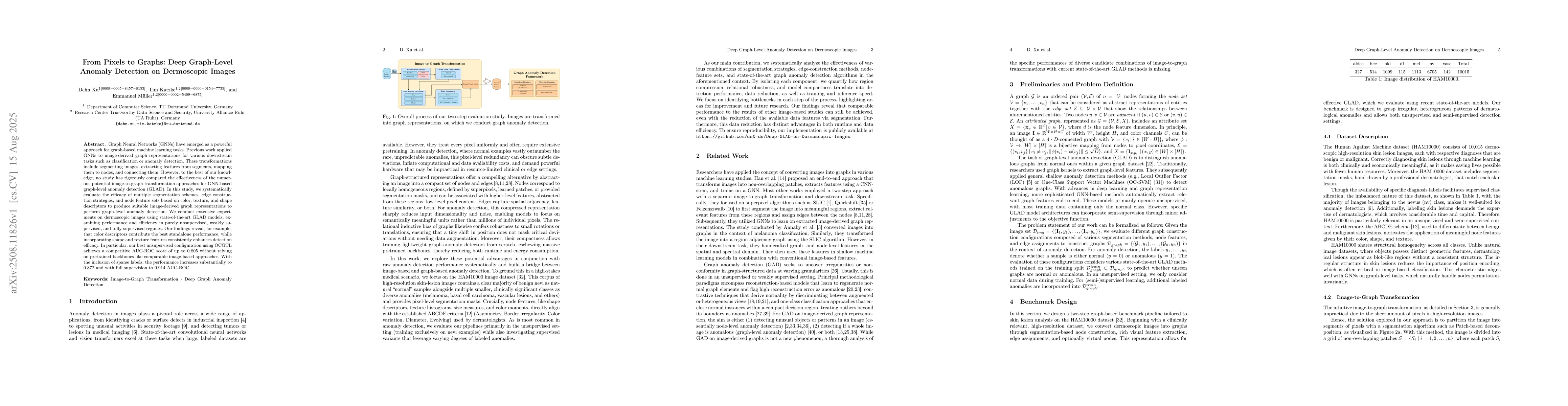 Graph Neural Networks (GNNs) have emerged as a powerful approach for graph-based machine learning tasks. Previous work applied GNNs to image-derived graph representations for various downstream tasks such as classification or anomaly detection. These transformations include segmenting images, extracting features from segments, mapping them to nodes, and connecting them. However, to the best of our knowledge, no study has rigorously compared the effectiveness of the numerous potential image-to-graph transformation approaches for GNN-based graph-level anomaly detection (GLAD). In this study, we systematically evaluate the efficacy of multiple segmentation schemes, edge construction strategies, and node feature sets based on color, texture, and shape descriptors to produce suitable image-derived graph representations to perform graph-level anomaly detection. We conduct extensive experiments on dermoscopic images using state-of-the-art GLAD models, examining performance and efficiency in purely unsupervised, weakly supervised, and fully supervised regimes. Our findings reveal, for example, that color descriptors contribute the best standalone performance, while incorporating shape and texture features consistently enhances detection efficacy. In particular, our best unsupervised configuration using OCGTL achieves a competitive AUC-ROC score of up to 0.805 without relying on pretrained backbones like comparable image-based approaches. With the inclusion of sparse labels, the performance increases substantially to 0.872 and with full supervision to 0.914 AUC-ROC.