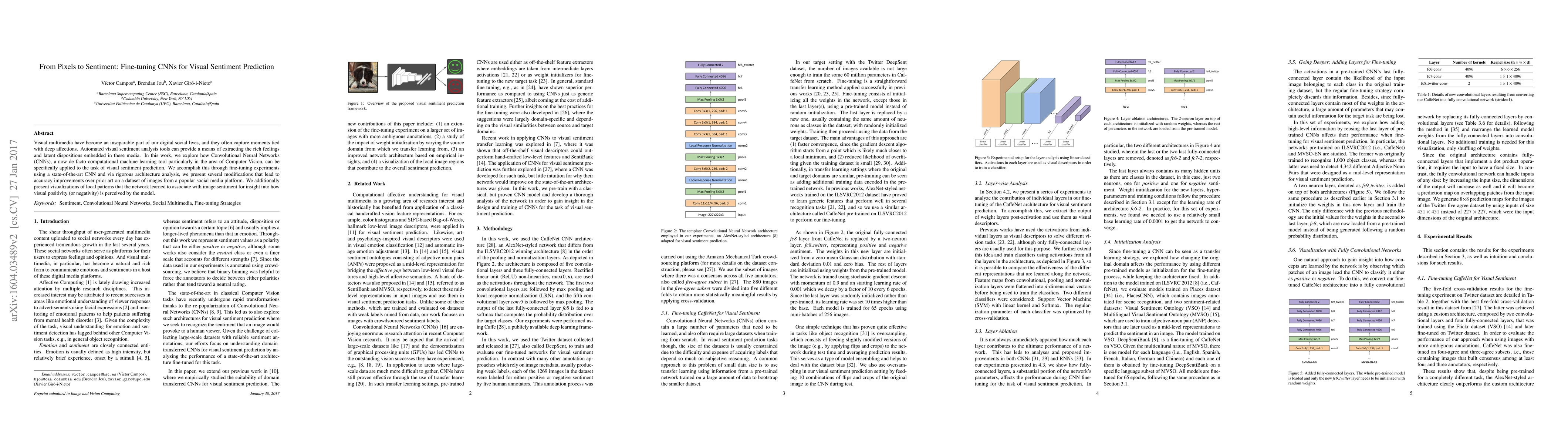 Visual multimedia have become an inseparable part of our digital social lives, and they often capture moments tied with deep affections. Automated visual sentiment analysis tools can provide a means of extracting the rich feelings and latent dispositions embedded in these media. In this work, we explore how Convolutional Neural Networks (CNNs), a now de facto computational machine learning tool particularly in the area of Computer Vision, can be specifically applied to the task of visual sentiment prediction. We accomplish this through fine-tuning experiments using a state-of-the-art CNN and via rigorous architecture analysis, we present several modifications that lead to accuracy improvements over prior art on a dataset of images from a popular social media platform. We additionally present visualizations of local patterns that the network learned to associate with image sentiment for insight into how visual positivity (or negativity) is perceived by the model.