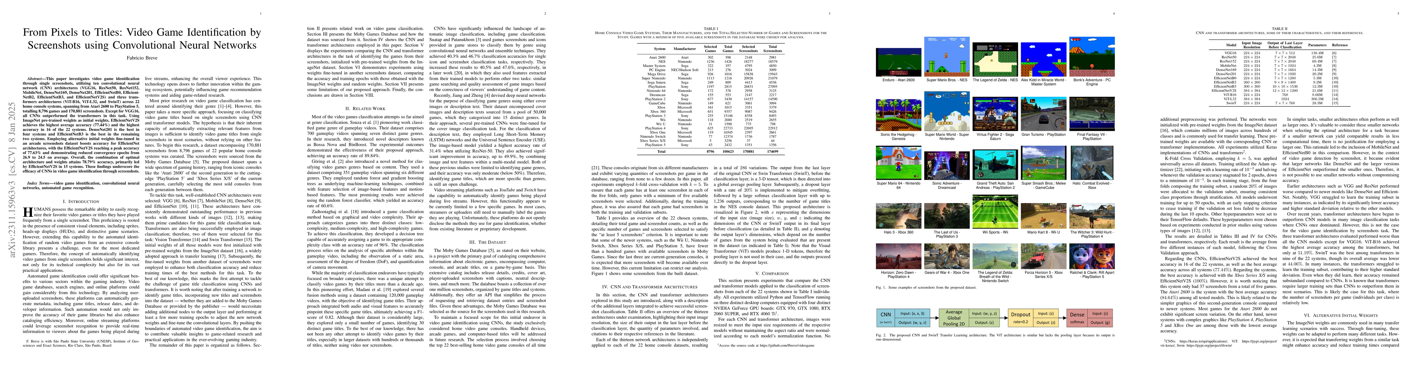 This study identifies video games from screenshots using various CNN architectures, finding that EfficientNetB3, when initialized with ImageNet weights, achieves the highest accuracy at 74.51%. Alternative initial weights from an arcade dataset further boost performance, especially for EfficientNetB3, which reaches 76.36% accuracy and reduces training epochs.