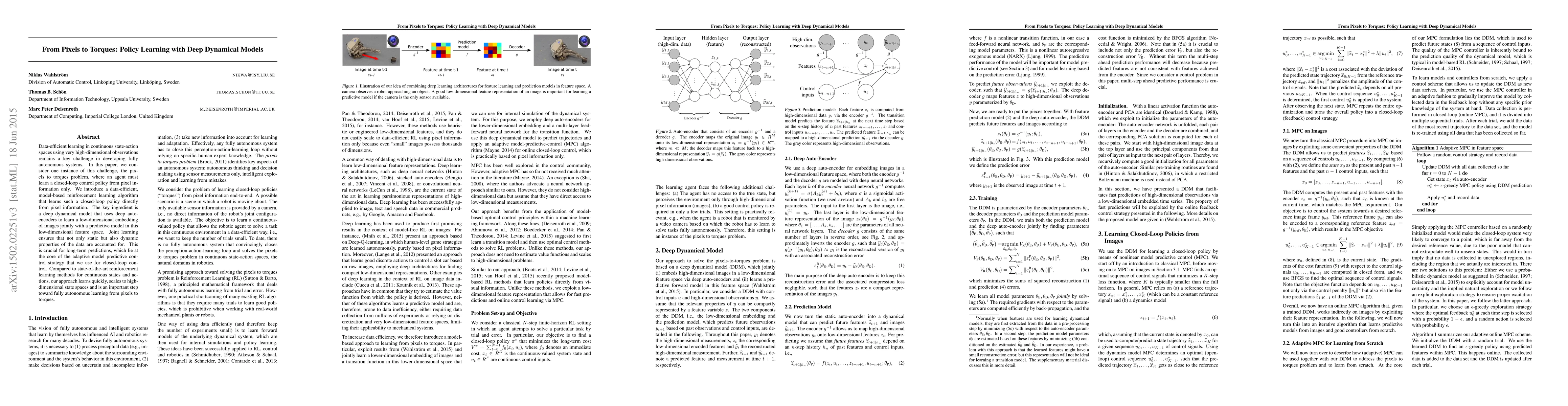 Data-efficient learning in continuous state-action spaces using very high-dimensional observations remains a key challenge in developing fully autonomous systems. In this paper, we consider one instance of this challenge, the pixels to torques problem, where an agent must learn a closed-loop control policy from pixel information only. We introduce a data-efficient, model-based reinforcement learning algorithm that learns such a closed-loop policy directly from pixel information. The key ingredient is a deep dynamical model that uses deep auto-encoders to learn a low-dimensional embedding of images jointly with a predictive model in this low-dimensional feature space. Joint learning ensures that not only static but also dynamic properties of the data are accounted for. This is crucial for long-term predictions, which lie at the core of the adaptive model predictive control strategy that we use for closed-loop control. Compared to state-of-the-art reinforcement learning methods for continuous states and actions, our approach learns quickly, scales to high-dimensional state spaces and is an important step toward fully autonomous learning from pixels to torques.