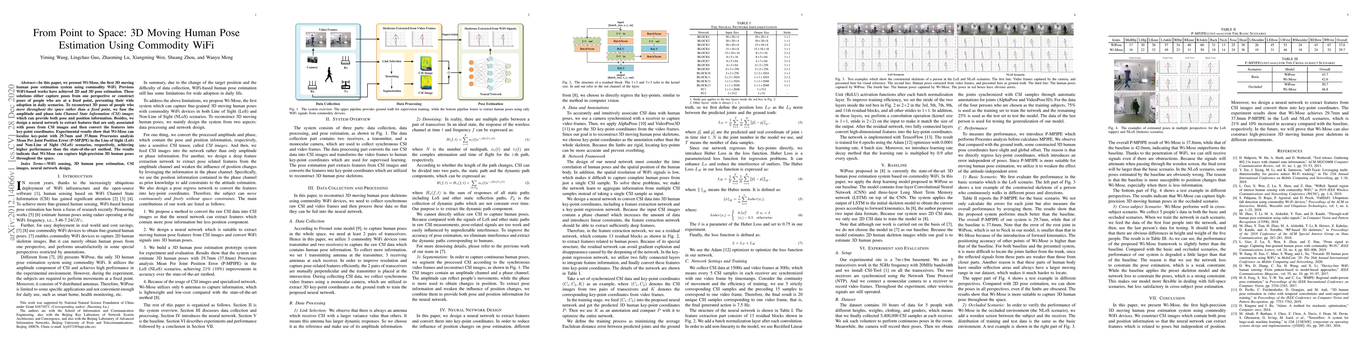 Wi-Mose is a novel system using commodity WiFi to estimate 3D moving human poses by fusing amplitude and phase data from Channel State Information (CSI) images. It achieves higher accuracy in both Line of Sight and Non-Line of Sight scenarios compared to existing methods.