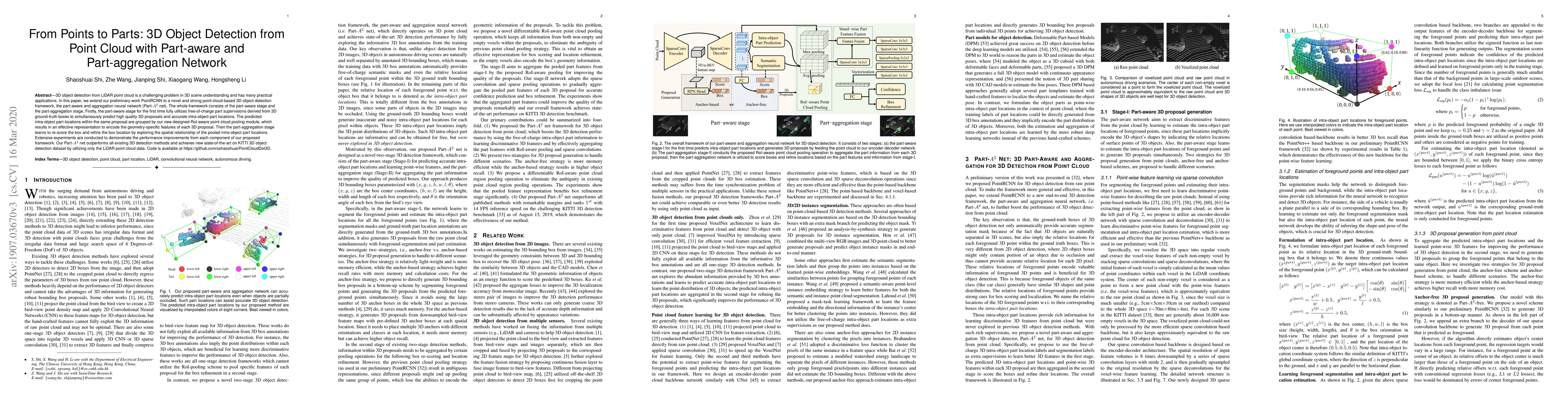 This paper introduces Part-$A^2$ net, a novel framework for 3D object detection from LiDAR point clouds, which includes a part-aware stage and a part-aggregation stage. The part-aware stage predicts 3D proposals and intra-object part locations, while the part-aggregation stage refines the detections using pooled part locations, achieving state-of-the-art results on the KITTI dataset.