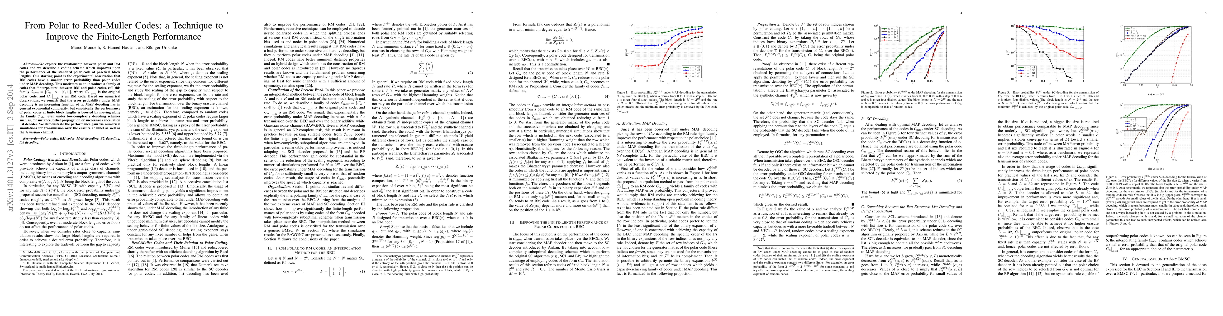 We explore the relationship between polar and RM codes and we describe a coding scheme which improves upon the performance of the standard polar code at practical block lengths. Our starting point is the experimental observation that RM codes have a smaller error probability than polar codes under MAP decoding. This motivates us to introduce a family of codes that "interpolates" between RM and polar codes, call this family ${\mathcal C}_{\rm inter} = \{C_{\alpha} : \alpha \in [0, 1]\}$, where $C_{\alpha} \big |_{\alpha = 1}$ is the original polar code, and $C_{\alpha} \big |_{\alpha = 0}$ is an RM code. Based on numerical observations, we remark that the error probability under MAP decoding is an increasing function of $\alpha$. MAP decoding has in general exponential complexity, but empirically the performance of polar codes at finite block lengths is boosted by moving along the family ${\mathcal C}_{\rm inter}$ even under low-complexity decoding schemes such as, for instance, belief propagation or successive cancellation list decoder. We demonstrate the performance gain via numerical simulations for transmission over the erasure channel as well as the Gaussian channel.