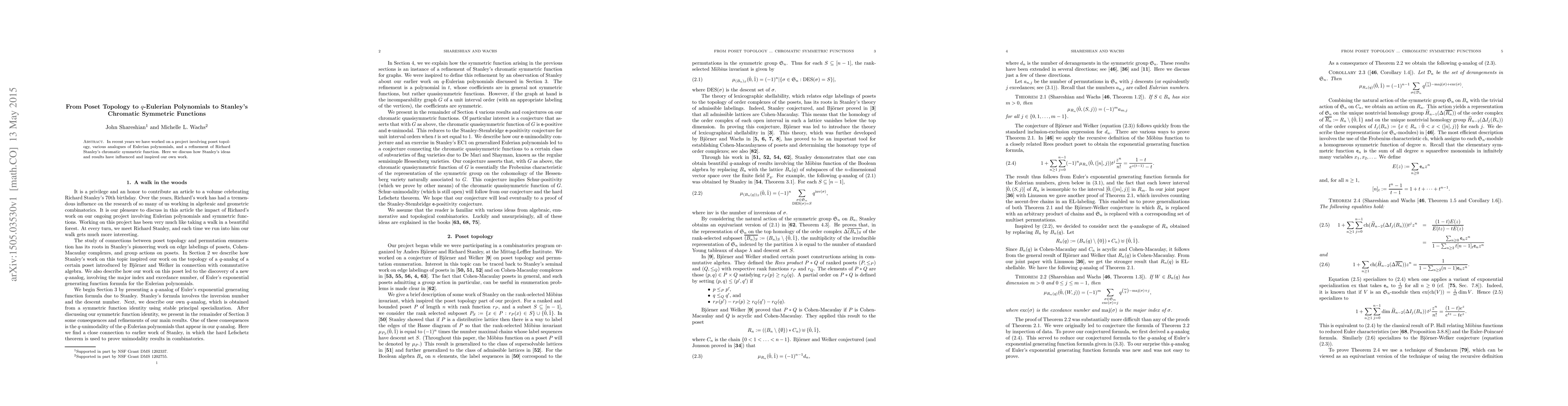 In recent years we have worked on a project involving poset topology, various analogues of Eulerian polynomials, and a refinement of Richard Stanley's chromatic symmetric function. Here we discuss how Stanley's ideas and results have influenced and inspired our own work.