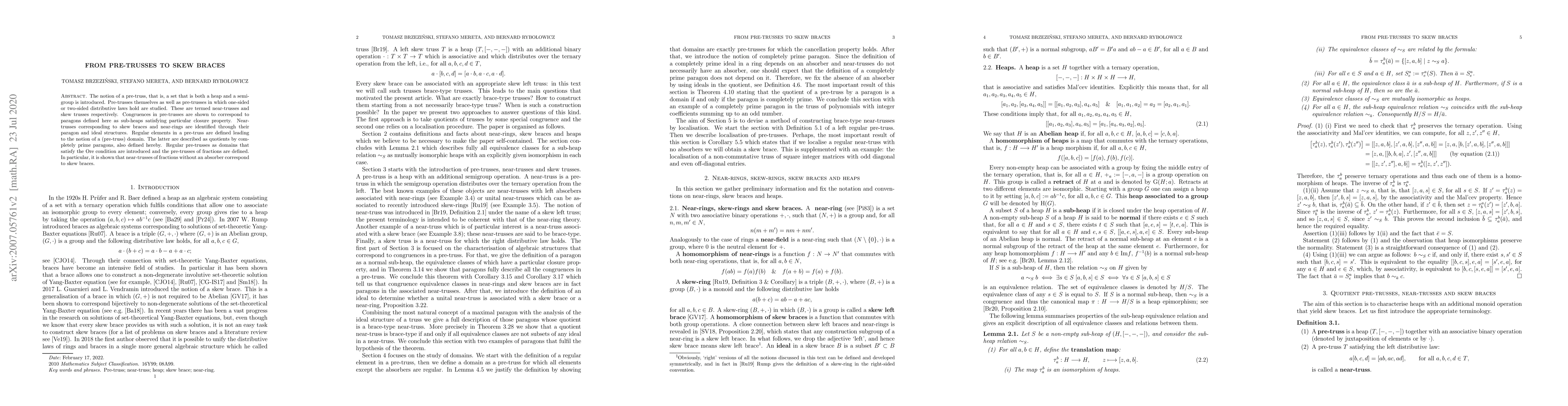 The notion of a pre-truss, that is, a set that is both a heap and a semigroup is introduced. Pre-trusses themselves as well as pre-trusses in which one-sided or two-sided distributive laws hold are studied. These are termed near-trusses and skew trusses respectively. Congruences in pre-trusses are shown to correspond to paragons defined here as sub-heaps satisfying particular closure property. Near-trusses corresponding to skew braces and near-rings are identified through their paragon and ideal structures. Regular elements in a pre-truss are defined leading to the notion of a (pre-truss) domain. The latter are described as quotients by completely prime paragons, also defined hereby. Regular pre-trusses as domains that satisfy the Ore condition are introduced and the pre-trusses of fractions are defined. In particular, it is shown that near-trusses of fractions without an absorber correspond to skew braces.