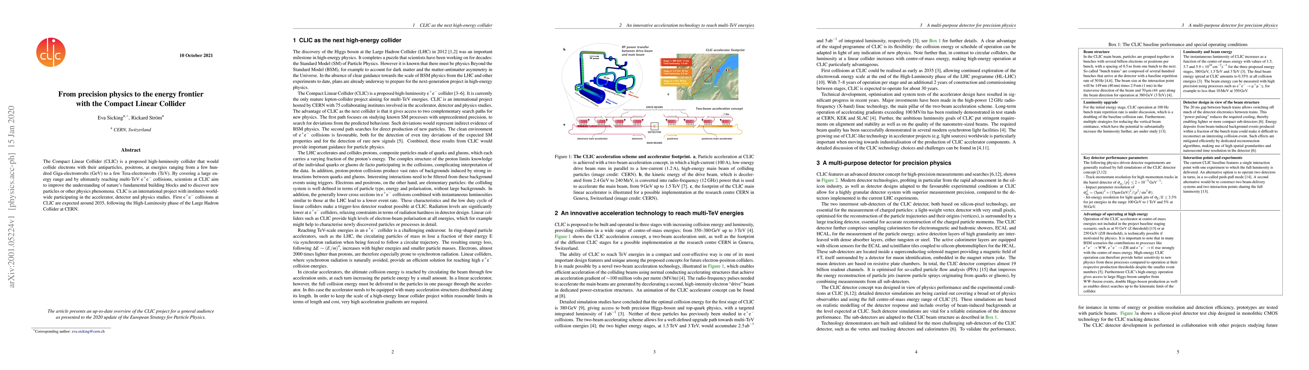 The Compact Linear Collider (CLIC) aims to study nature's fundamental building blocks at high energies, aiming for discoveries in particle physics around 2035. It will collide electrons with their antiparticles at energies from a few hundred GeV to multi-TeV levels.