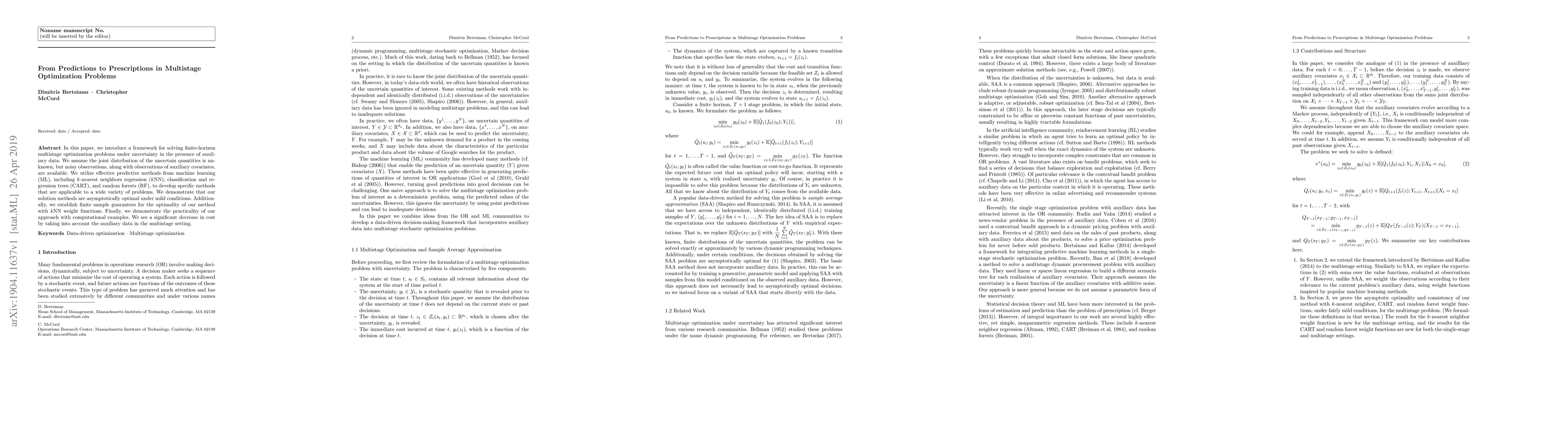 This paper presents a framework for solving multistage optimization problems under uncertainty using machine learning methods like $k$NN, CART, and RF, even when the joint distribution of uncertain quantities is unknown. The proposed solution methods are shown to be asymptotically optimal and provide finite sample guarantees, demonstrating practical cost reductions through the use of auxiliary data.