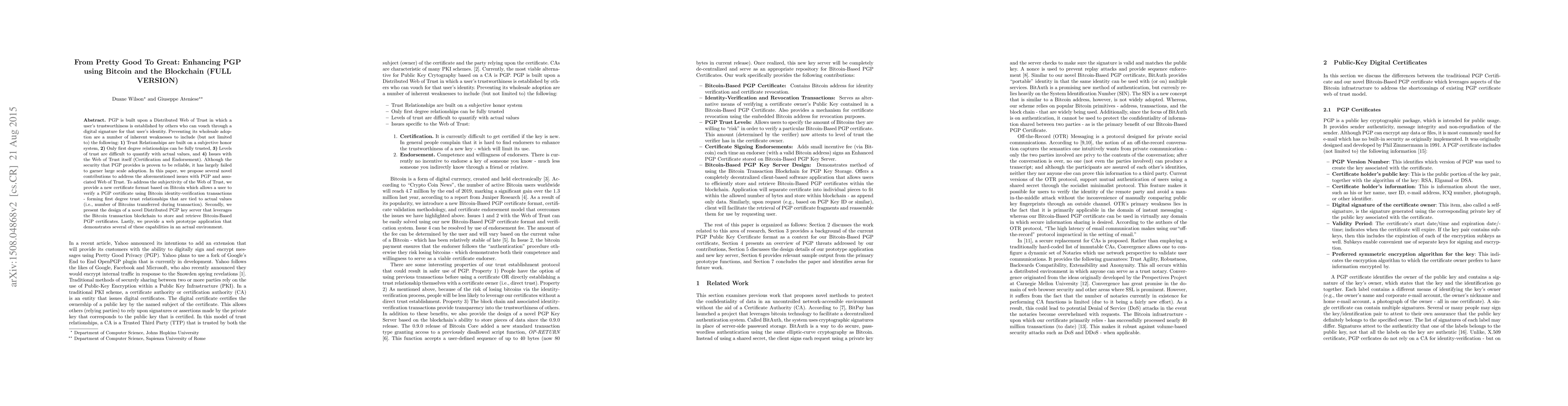 This paper proposes enhancements to PGP using Bitcoin and blockchain to address its adoption issues, including a new certificate format based on Bitcoin transactions to establish trust and a Distributed PGP key server using the Bitcoin blockchain for secure certificate storage and retrieval.