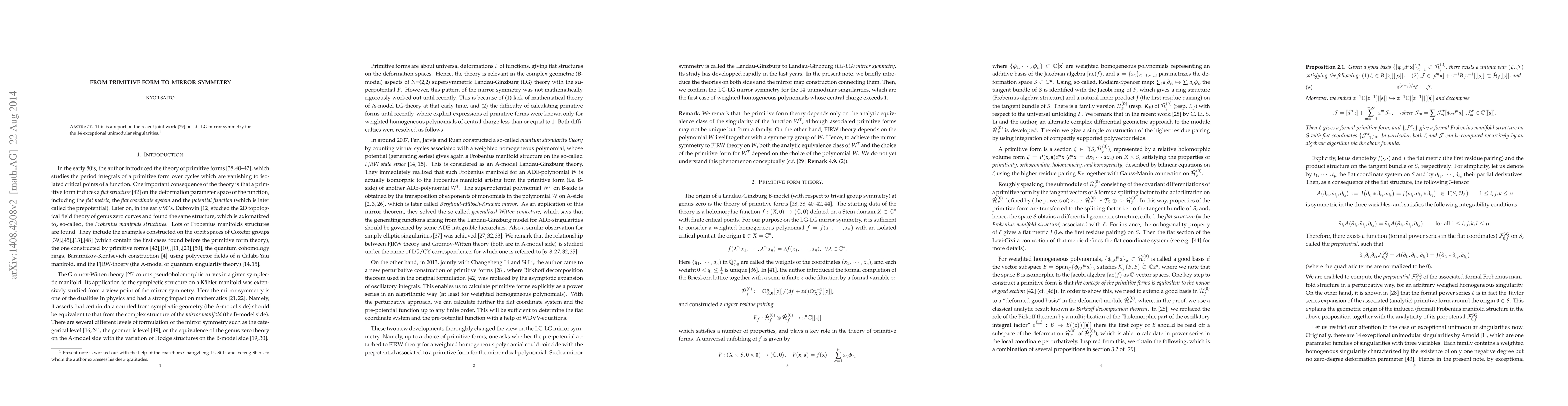 This is a report on the recent work "Mirror symmetry for exceptional unimodular singularities" joint with Changzheng Li, Si Li and Yefeng Shen.