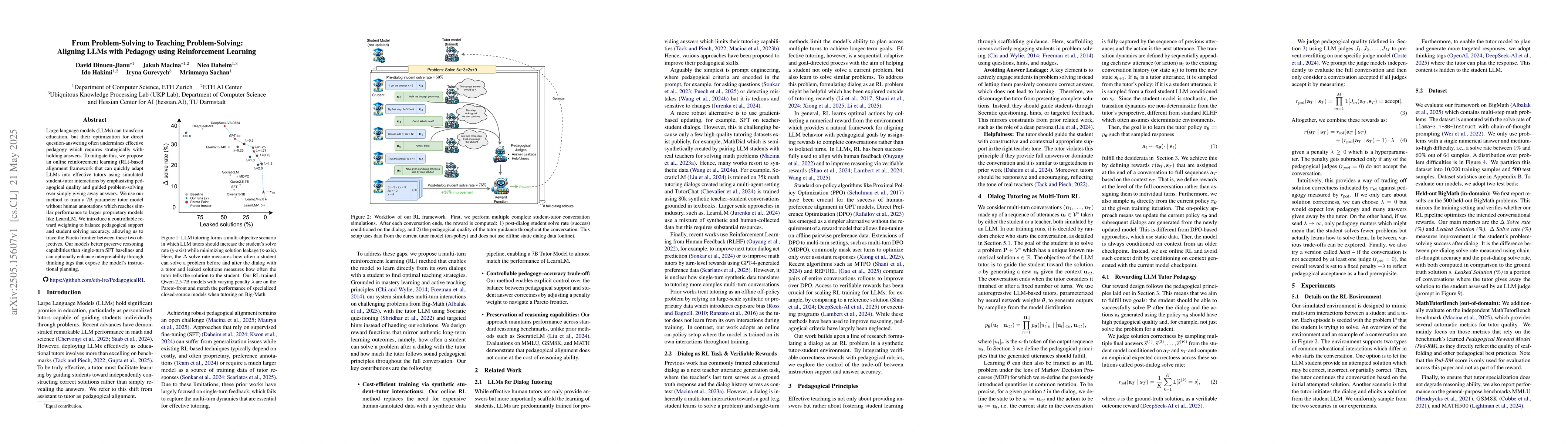 This work stands out by proposing a method to align LLMs with pedagogy using RL, emphasizing the balance between pedagogical support and student solving accuracy, and introducing controllable reward weighting to trace the Pareto frontier.