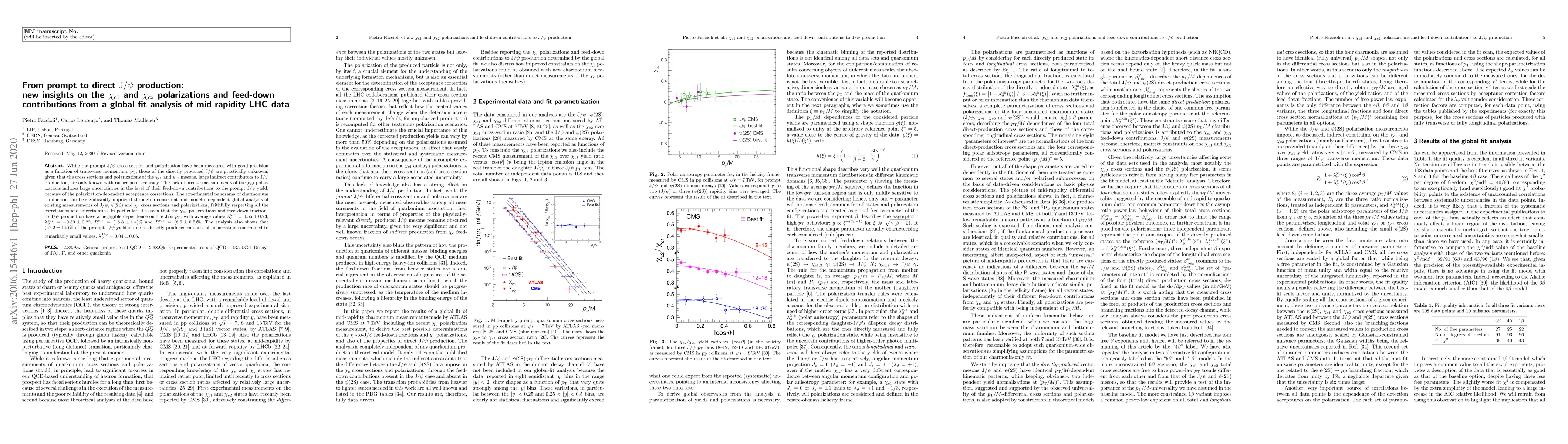While the prompt J/$\psi$ cross section and polarization have been measured with good precision as a function of transverse momentum, $p_{\rm T}$, those of the directly produced J/$\psi$ are practically unknown, given that the cross sections and polarizations of the $\chi_{c1}$ and $\chi_{c2}$ mesons, large indirect contributors to J/$\psi$ production, are only known with rather poor accuracy. The lack of precise measurements of the $\chi_{cJ}$ polarizations induces large uncertainties in the level of their feed-down contributions to the prompt J/$\psi$ yield, because of the polarization-dependent acceptance corrections. The experimental panorama of charmonium production can be significantly improved through a consistent and model-independent global analysis of existing measurements of J/$\psi$, $\psi$(2S) and $\chi_{c}$ cross sections and polarizations, faithfully respecting all the correlations and uncertainties. In particular, it is seen that the $\chi_{cJ}$ polarizations and feed-down fractions to J/$\psi$ production have a negligible dependence on the J/$\psi$ $p_{\rm T}$, with average values $\lambda_\vartheta^{\chi_{c1}} = 0.55 \pm 0.23$, $\lambda_\vartheta^{\chi_{c2}} = -0.39 \pm 0.22$, $R^{\chi_{c1}} = (18.8 \pm 1.4)\%$ and $R^{\chi_{c2}} = (6.5 \pm 0.5)\%$. The analysis also shows that $(67.2 \pm 1.9)\%$ of the prompt J/$\psi$ yield is due to directly-produced mesons, of polarization constrained to remarkably small values, $\lambda_\vartheta^{{\rm J}/\psi} = 0.04 \pm 0.06$.