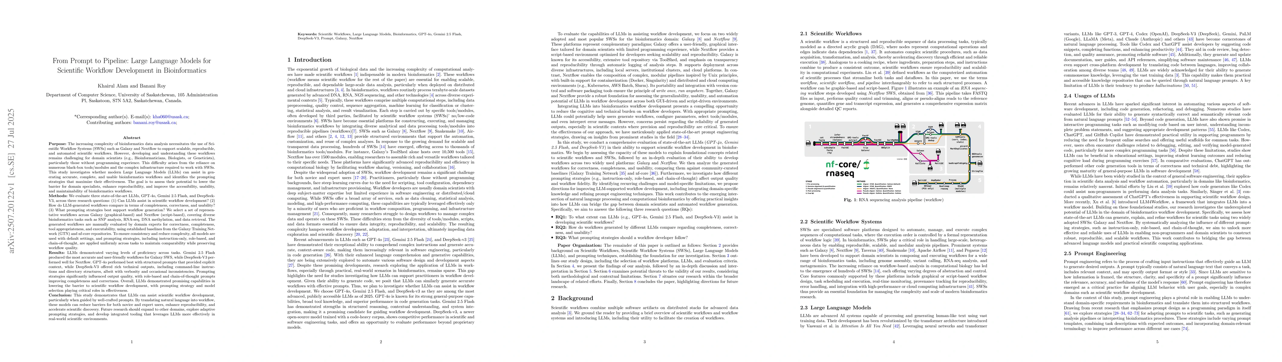 The increasing complexity of bioinformatics data analysis has made Scientific Workflow Systems (SWSs) like Galaxy and Nextflow essential for enabling scalable, reproducible, and automated workflows. However, creating and understanding these workflows remains challenging, particularly for domain experts without programming expertise. This study investigates whether modern Large Language Models (LLMs), GPT-4o, Gemini 2.5 Flash, and DeepSeek-V3, can support the generation of accurate, complete, and usable bioinformatics workflows, and examines which prompting strategies most effectively guide this process. We evaluate these models using diverse tasks such as SNP analysis, RNA-seq, DNA methylation, and data retrieval, spanning both graphical (Galaxy) and script-based (Nextflow) platforms. Expert reviewers assess the generated workflows against community-curated baselines from the Galaxy Training Network and nf-core repositories. The results show that Gemini 2.5 Flash excels in generating Galaxy workflows, while DeepSeek-V3 performs strongly in Nextflow. Prompting strategies significantly impact quality, with role-based and chain-of-thought prompts improving completeness and correctness. While GPT-4o benefits from structured inputs, DeepSeek-V3 offers rich technical detail, albeit with some verbosity. Overall, the findings highlight the potential of LLMs to lower the barrier for workflow development, improve reproducibility, and democratize access to computational tools in bioinformatics, especially when combined with thoughtful prompt engineering.