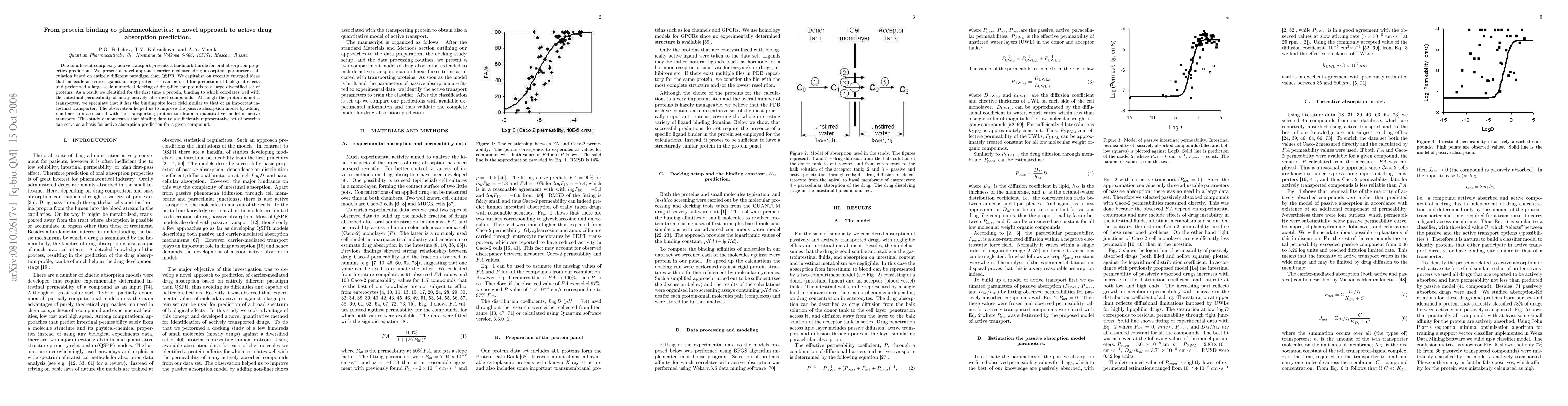 Due to inherent complexity active transport presents a landmark hurdle for oral absorption properties prediction. We present a novel approach carrier-mediated drug absorption parameters calculation based on entirely different paradigm than QSPR. We capitalize on recently emerged ideas that molecule activities against a large protein set can be used for prediction of biological effects and performed a large scale numerical docking of drug-like compounds to a large diversified set of proteins. As a result we identified for the first time a protein, binding to which correlates well with the intestinal permeability of many actively absorbed compounds. Although the protein is not a transporter, we speculate that it has the binding site force field similar to that of an important intestinal transporter. The observation helped us to improve the passive absorption model by adding non-liner flux associated with the transporting protein to obtain a quantitative model of active transport. This study demonstrates that binding data to a sufficiently representative set of proteins can serve as a basis for active absorption prediction for a given compound.
