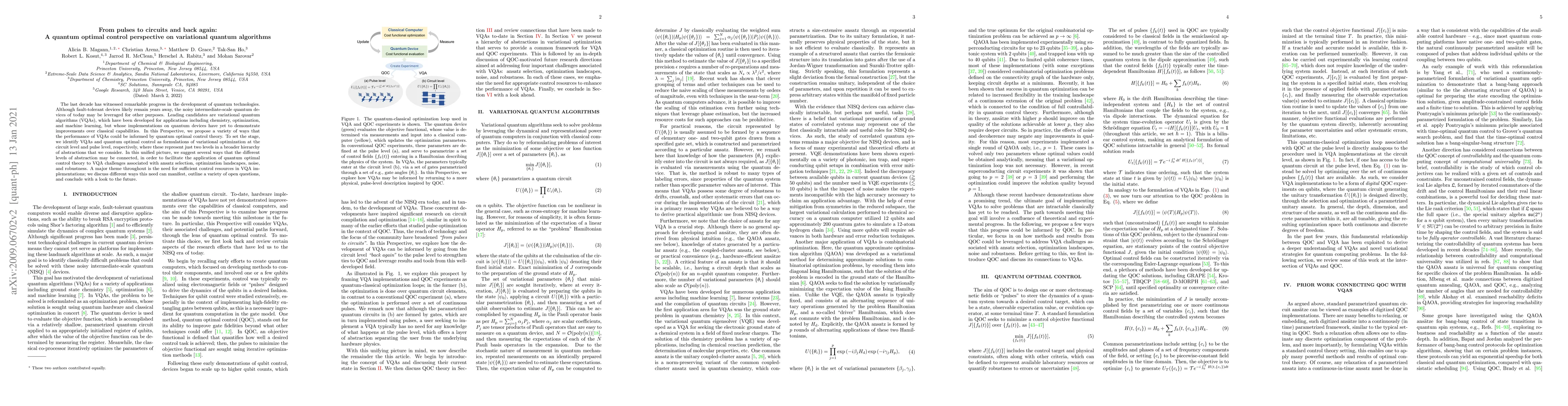 The last decade has witnessed remarkable progress in the development of quantum technologies. Although fault-tolerant devices likely remain years away, the noisy intermediate-scale quantum devices of today may be leveraged for other purposes. Leading candidates are variational quantum algorithms (VQAs), which have been developed for applications including chemistry, optimization, and machine learning, but whose implementations on quantum devices have yet to demonstrate improvements over classical capabilities. In this Perspective, we propose a variety of ways that the performance of VQAs could be informed by quantum optimal control theory. To set the stage, we identify VQAs and quantum optimal control as formulations of variational optimization at the circuit level and pulse level, respectively, where these represent just two levels in a broader hierarchy of abstractions that we consider. In this unified picture, we suggest several ways that the different levels of abstraction may be connected, in order to facilitate the application of quantum optimal control theory to VQA challenges associated with ansatz selection, optimization landscapes, noise, and robustness. A major theme throughout is the need for sufficient control resources in VQA implementations; we discuss different ways this need can manifest, outline a variety of open questions, and conclude with a look to the future.