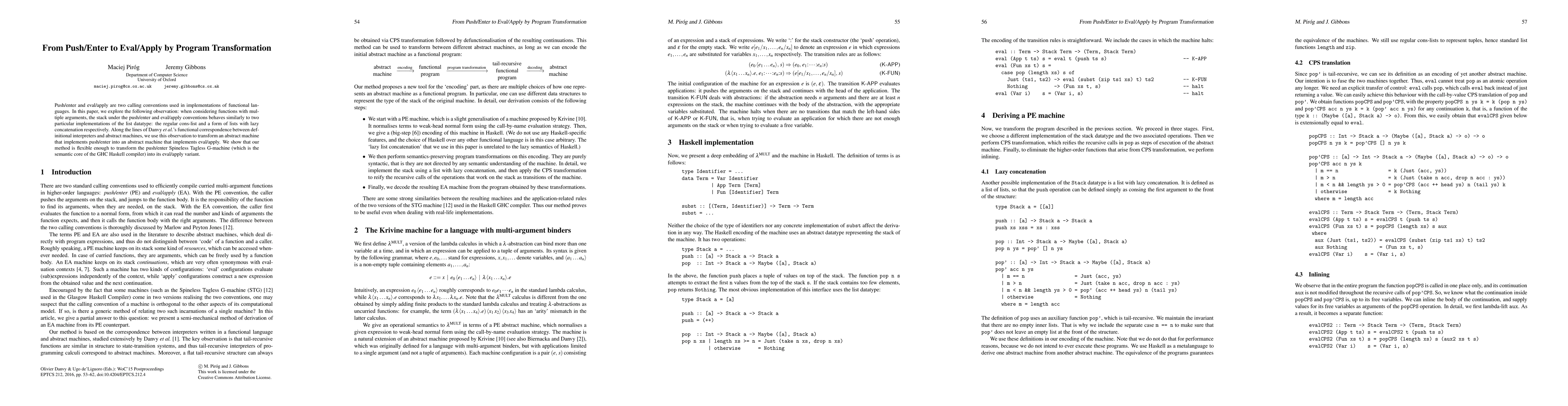 Push/enter and eval/apply are two calling conventions used in implementations of functional languages. In this paper, we explore the following observation: when considering functions with multiple arguments, the stack under the push/enter and eval/apply conventions behaves similarly to two particular implementations of the list datatype: the regular cons-list and a form of lists with lazy concatenation respectively. Along the lines of Danvy et al.'s functional correspondence between definitional interpreters and abstract machines, we use this observation to transform an abstract machine that implements push/enter into an abstract machine that implements eval/apply. We show that our method is flexible enough to transform the push/enter Spineless Tagless G-machine (which is the semantic core of the GHC Haskell compiler) into its eval/apply variant.