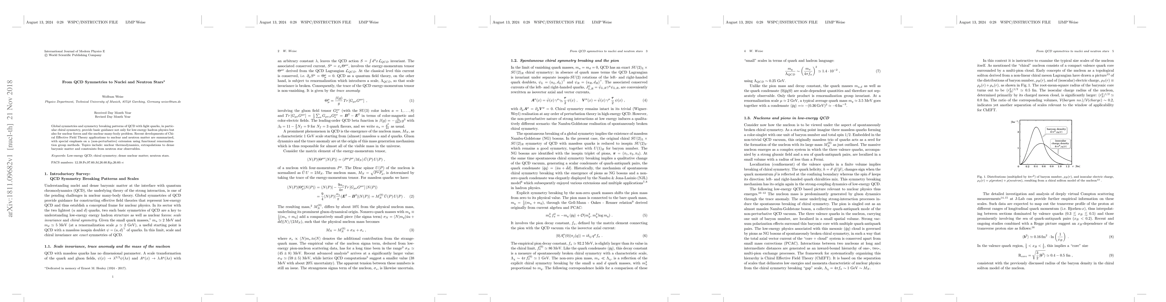 Global symmetries and symmetry breaking patterns of QCD with light quarks, in particular chiral symmetry, provide basic guidance not only for low-energy hadron physics but also for nuclear forces and the nuclear many-body problem. Recent developments of Chiral Effective Field Theory applications to nuclear and neutron matter are summarized, with special emphasis on a (non-perturbative) extension using functional renormalisation group methods. Topics include: nuclear thermodynamics, extrapolations to dense baryonic matter and constraints from neutron star observables.