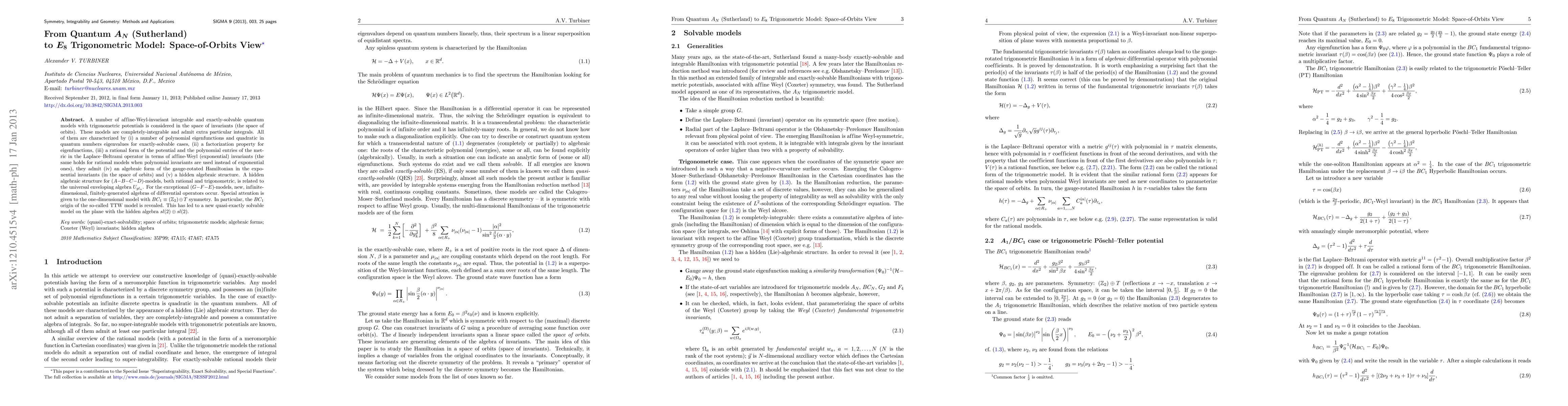 A number of affine-Weyl-invariant integrable and exactly-solvable quantum models with trigonometric potentials is considered in the space of invariants (the space of orbits). These models are completely-integrable and admit extra particular integrals. All of them are characterized by (i) a number of polynomial eigenfunctions and quadratic in quantum numbers eigenvalues for exactly-solvable cases, (ii) a factorization property for eigenfunctions, (iii) a rational form of the potential and the polynomial entries of the metric in the Laplace-Beltrami operator in terms of affine-Weyl (exponential) invariants (the same holds for rational models when polynomial invariants are used instead of exponential ones), they admit (iv) an algebraic form of the gauge-rotated Hamiltonian in the exponential invariants (in the space of orbits) and (v) a hidden algebraic structure. A hidden algebraic structure for $(A-B-C{-D)$-models, both rational and trigonometric, is related to the universal enveloping algebra $U_{gl_n}$. For the exceptional $(G-F-E)$-models, new, infinite-dimensional, finitely-generated algebras of differential operators occur. Special attention is given to the one-dimensional model with $BC_1\equiv(\mathbb{Z}_2)\oplus T$ symmetry. In particular, the $BC_1$ origin of the so-called TTW model is revealed. This has led to a new quasi-exactly solvable model on the plane with the hidden algebra $sl(2)\oplus sl(2)$.