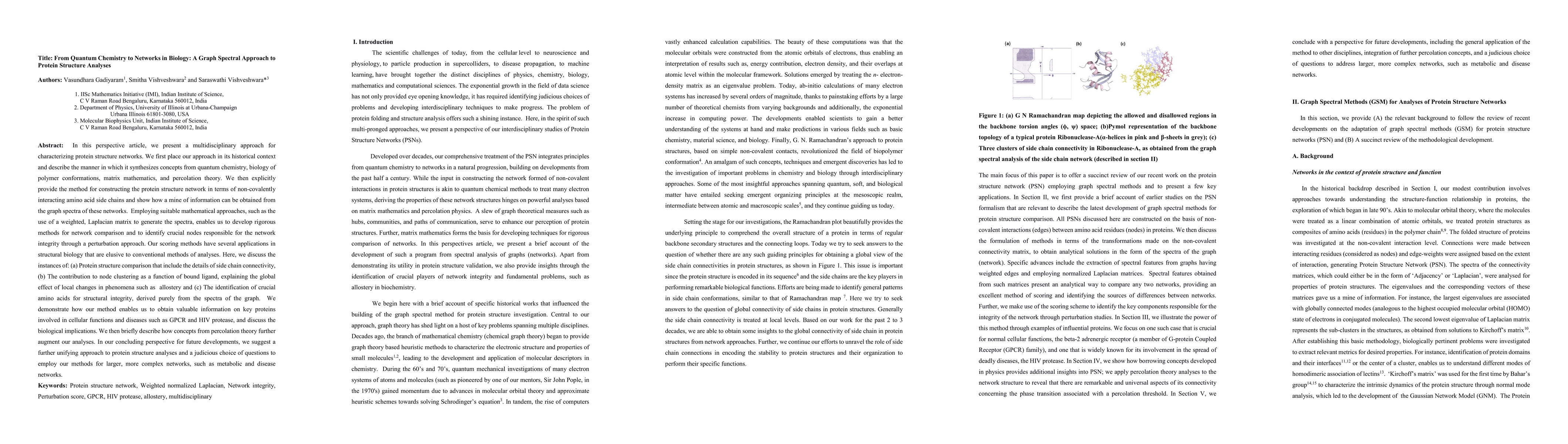 In this perspective article, we present a multidisciplinary approach for characterizing protein structure networks. We first place our approach in its historical context and describe the manner in which it synthesizes concepts from quantum chemistry, biology of polymer conformations, matrix mathematics, and percolation theory. We then explicitly provide the method for constructing the protein structure network in terms of non-covalently interacting amino acid side chains and show how a mine of information can be obtained from the graph spectra of these networks. Employing suitable mathematical approaches, such as the use of a weighted, Laplacian matrix to generate the spectra, enables us to develop rigorous methods for network comparison and to identify crucial nodes responsible for the network integrity through a perturbation approach. Our scoring methods have several applications in structural biology that are elusive to conventional methods of analyses. Here, we discuss the instances of: (a) Protein structure comparison that include the details of side chain connectivity, (b) The contribution to node clustering as a function of bound ligand, explaining the global effect of local changes in phenomena such as allostery and (c) The identification of crucial amino acids for structural integrity, derived purely from the spectra of the graph. We demonstrate how our method enables us to obtain valuable information on key proteins involved in cellular functions and diseases such as GPCR and HIV protease, and discuss the biological implications. We then briefly describe how concepts from percolation theory further augment our analyses. In our concluding perspective for future developments, we suggest a further unifying approach to protein structure analyses and a judicious choice of questions to employ our methods for larger, more complex networks, such as metabolic and disease networks.