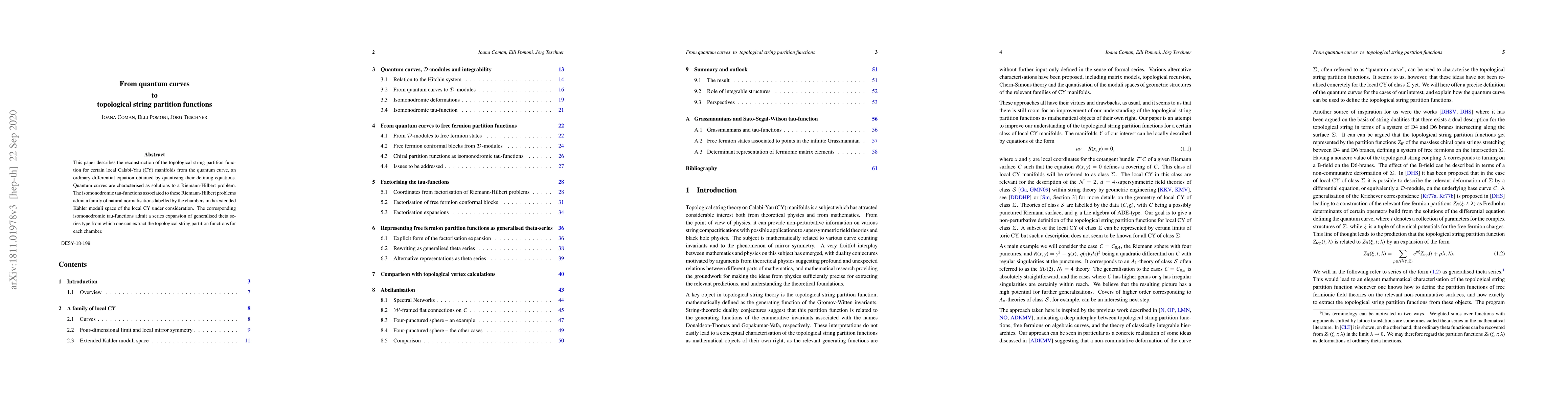 This paper reconstructs topological string partition functions for specific local Calabi-Yau manifolds from quantum curves, using isomonodromic tau-functions derived from Riemann-Hilbert problems and generalised theta series expansions. The method links quantum curves to partition functions through normalised tau-functions in the extended Kähler moduli space.