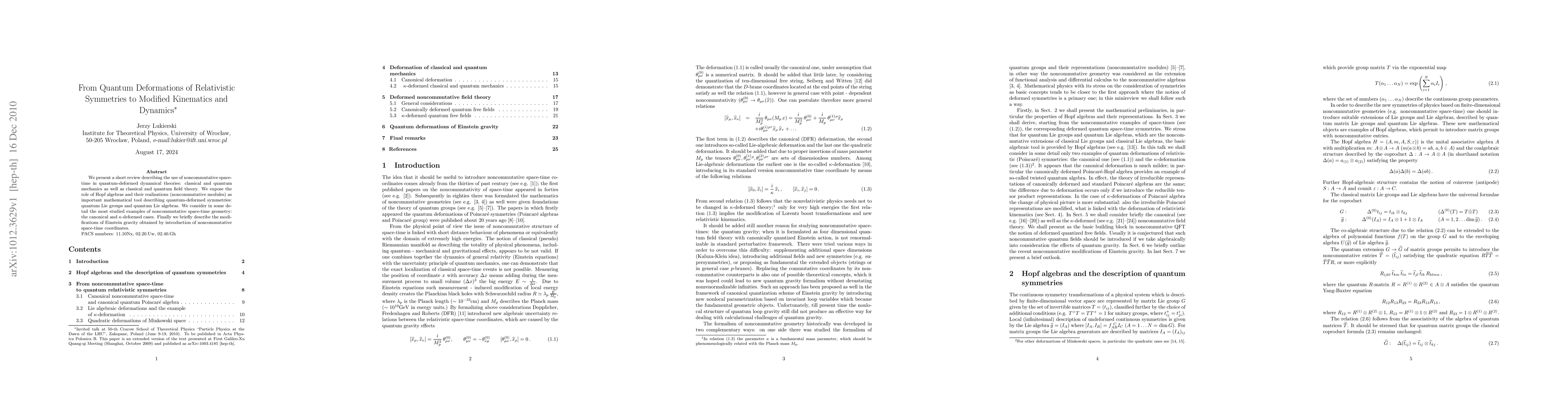 We present a short review describing the use of noncommutative space-time in quantum-deformed dynamical theories: classical and quantum mechanics as well as classical and quantum field theory. We expose the role of Hopf algebras and their realizations (noncommutative modules) as important mathematical tool describing quantum-deformed symmetries: quantum Lie groups and quantum Lie algebras. We consider in some detail the most studied examples of noncommutative space-time geometry: the canonical and $\kappa$-deformed cases. Finally we briefly describe the modifications of Einstein gravity obtained by introduction of noncommutative space-time coordinates.