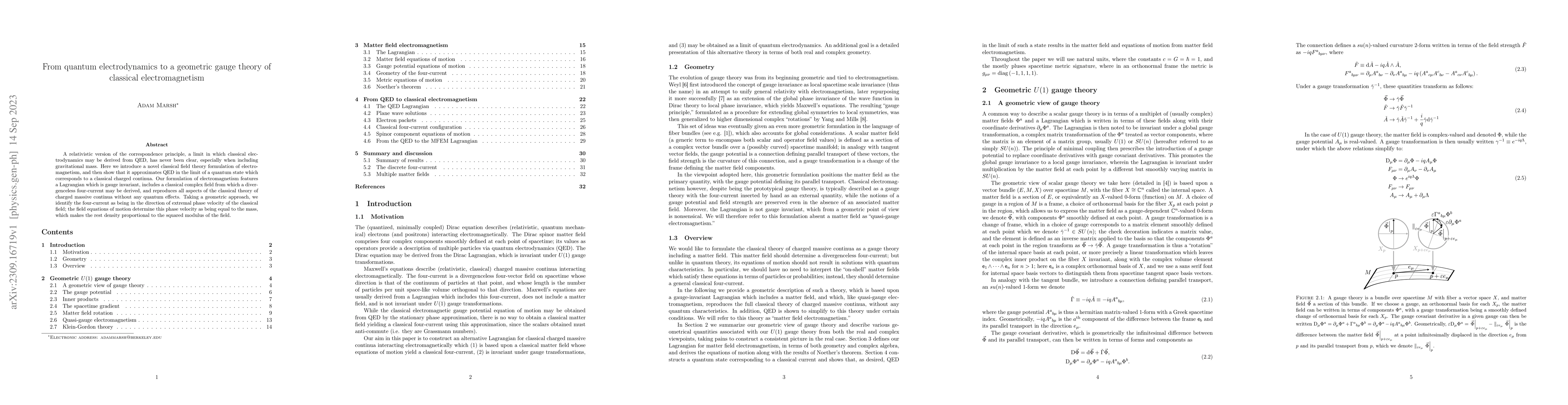 A relativistic version of the correspondence principle, a limit in which classical electrodynamics may be derived from QED, has never been clear, especially when including gravitational mass. Here we introduce a novel classical field theory formulation of electromagnetism, and then show that it approximates QED in the limit of a quantum state which corresponds to a classical charged continua. Our formulation of electromagnetism features a Lagrangian which is gauge invariant, includes a classical complex field from which a divergenceless four-current may be derived, and reproduces all aspects of the classical theory of charged massive continua without any quantum effects. Taking a geometric approach, we identify the four-current as being in the direction of extremal phase velocity of the classical field; the field equations of motion determine this phase velocity as being equal to the mass, which makes the rest density proportional to the squared modulus of the field.