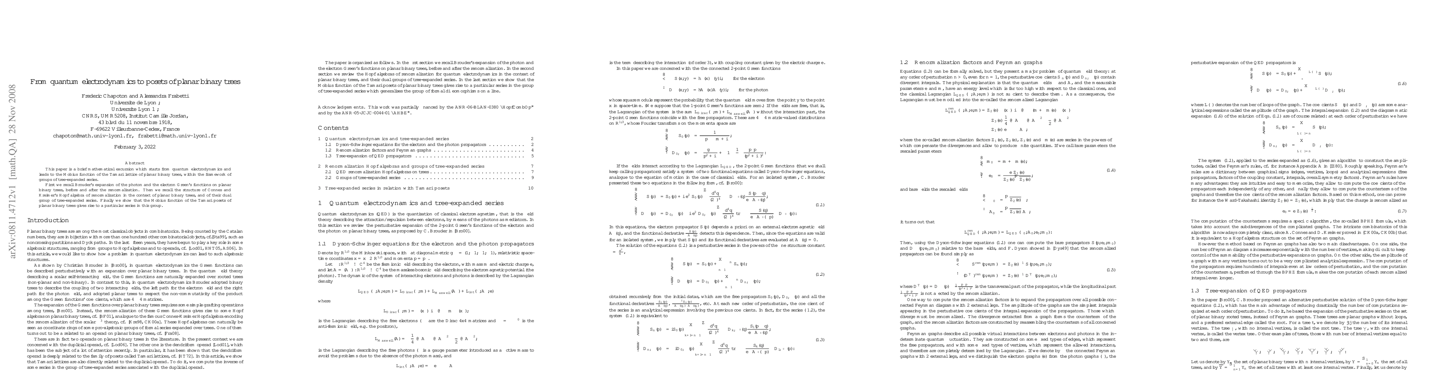 The paper presents a mathematical excursion starting from quantum electrodynamics (QED) and leading to the Moebius function of the Tamari lattice of planar binary trees, using groups of tree-expanded series.