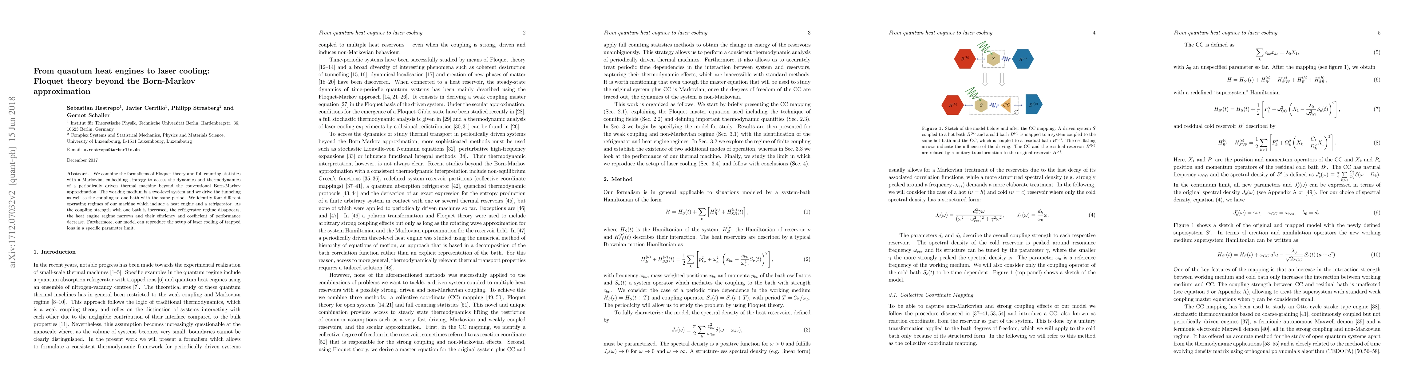 We combine the formalisms of Floquet theory and full counting statistics with a Markovian embedding strategy to access the dynamics and thermodynamics of a periodically driven thermal machine beyond the conventional Born-Markov approximation. The working medium is a two-level system and we drive the tunneling as well as the coupling to one bath with the same period. We identify four different operating regimes of our machine which include a heat engine and a refrigerator. As the coupling strength with one bath is increased, the refrigerator regime disappears, the heat engine regime narrows and their efficiency and coefficient of performance decrease. Furthermore, our model can reproduce the setup of laser cooling of trapped ions in a specific parameter limit.