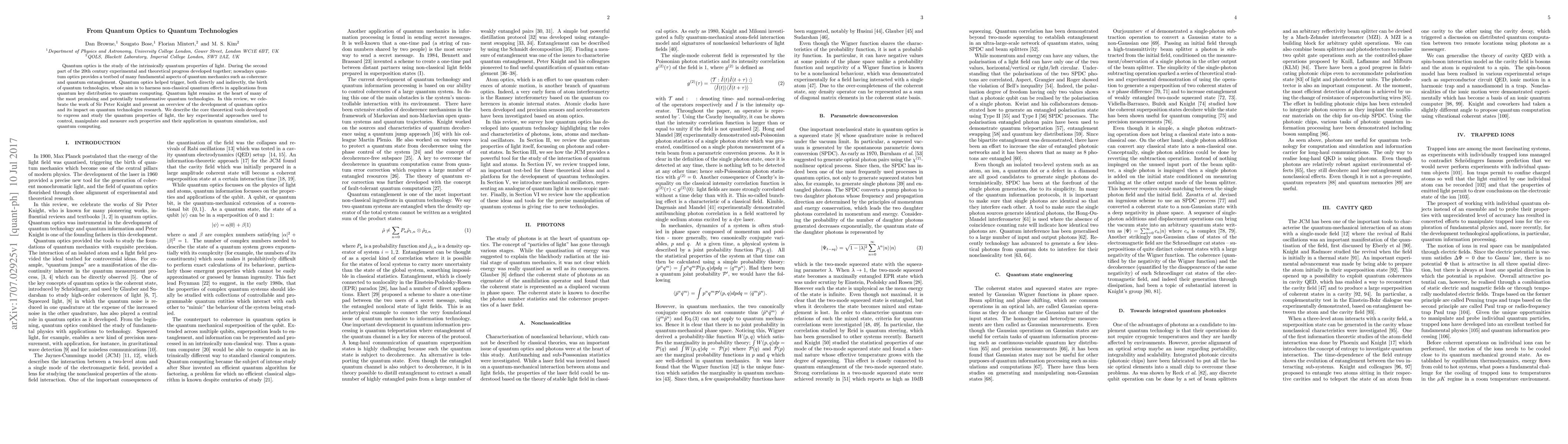 Quantum optics is the study of the intrinsically quantum properties of light. During the second part of the 20th century experimental and theoretical progress developed together; nowadays quantum optics provides a testbed of many fundamental aspects of quantum mechanics such as coherence and quantum entanglement. Quantum optics helped trigger, both directly and indirectly, the birth of quantum technologies, whose aim is to harness non-classical quantum effects in applications from quantum key distribution to quantum computing. Quantum light remains at the heart of many of the most promising and potentially transformative quantum technologies. In this review, we celebrate the work of Sir Peter Knight and present an overview of the development of quantum optics and its impact on quantum technologies research. We describe the core theoretical tools developed to express and study the quantum properties of light, the key experimental approaches used to control, manipulate and measure such properties and their application in quantum simulation, and quantum computing.