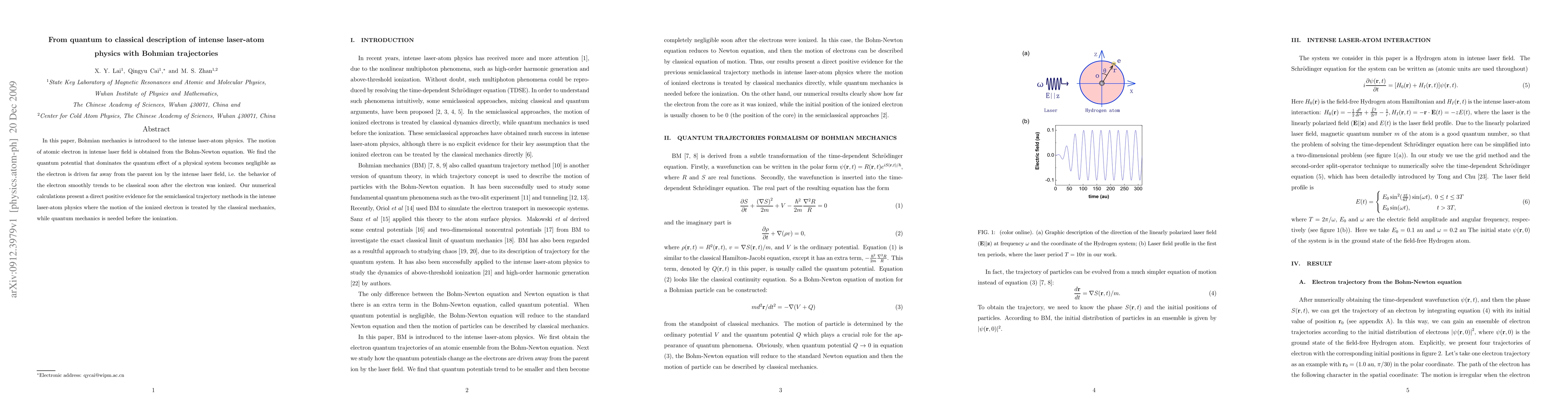 This paper applies Bohmian mechanics to intense laser-atom interactions, showing that the quantum potential diminishes as electrons are driven away from ions by laser fields, leading to classical electron behavior post-ionization. Numerical results support semiclassical trajectory methods for describing the ionized electron's motion classically.