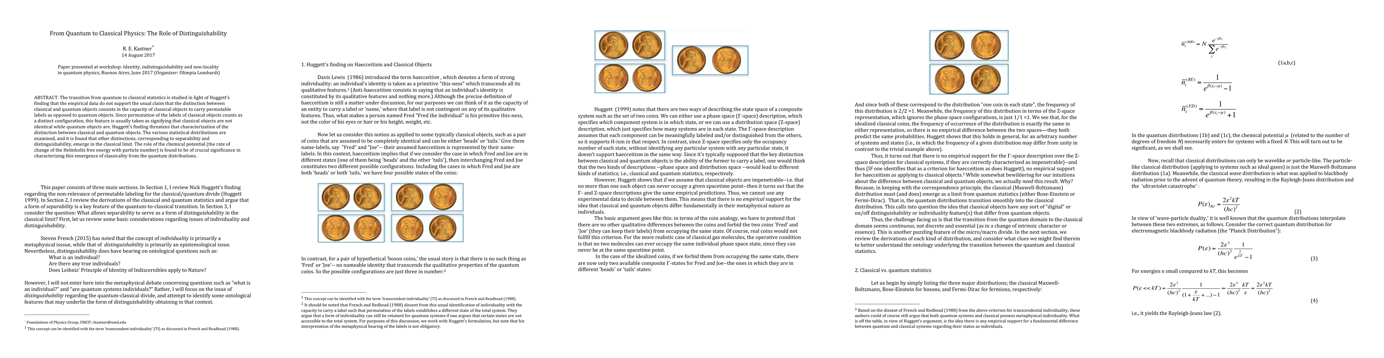 The transition from quantum to classical statistics is studied in light of Huggett's finding that the empirical data do not support the usual claim that the distinction between classical and quantum objects consists in the capacity of classical objects to carry permutable labels as opposed to quantum objects. Since permutation of the labels of classical objects counts as a distinct configuration, this feature is usually taken as signifying that classical objects are not identical while quantum objects are. Huggett's finding threatens that characterization of the distinction between classical and quantum objects. The various statistical distributions are examined, and it is found that other distinctions, corresponding to separability and distinguishability, emerge in the classical limit. The role of the chemical potential (the rate of change of the Helmholtz free energy with particle number) is found to be of crucial significance in characterizing this emergence of classicality from the quantum distributions.