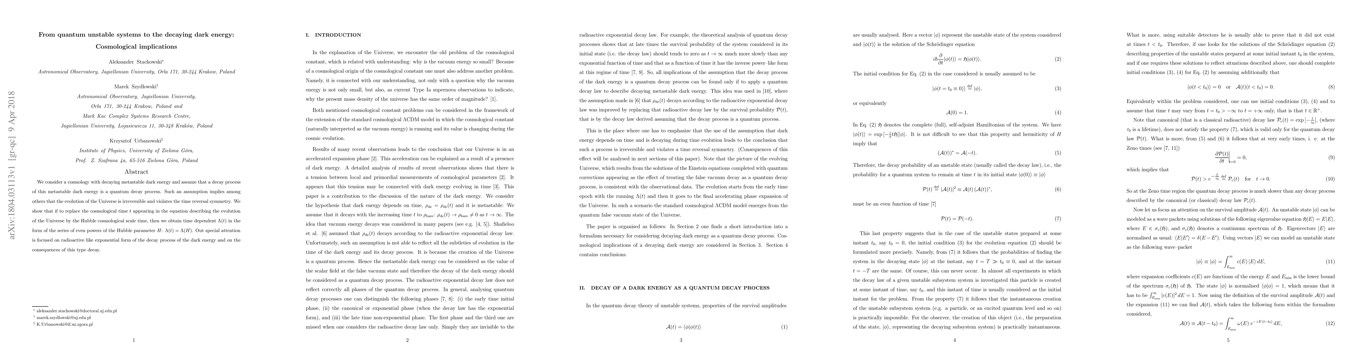 We consider a cosmology with decaying metastable dark energy and assume that a decay process of this metastable dark energy is a quantum decay process. Such an assumption implies among others that the evolution of the Universe is irreversible and violates the time reversal symmetry. We show that if to replace the cosmological time $t$ appearing in the equation describing the evolution of the Universe by the Hubble cosmological scale time, then we obtain time dependent $\Lambda (t)$ in the form of the series of even powers of the Hubble parameter $H$: $\Lambda (t) = \Lambda (H)$. Out special attention is focused on radioactive like exponential form of the decay process of the dark energy and on the consequences of this type decay.