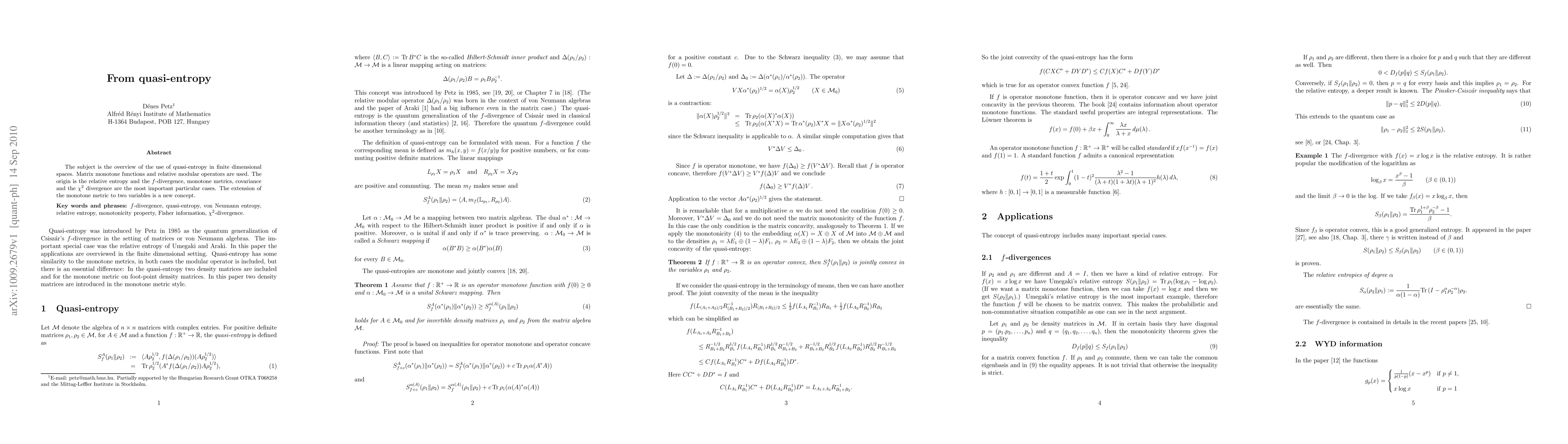 The subject is the overview of the use of quasi-entropy in finite dimensional spaces. Matrix monotone functions and relative modular operators are used. The origin is the relative entropy and the f-divergence, monotone metrics, covariance and the chi-square-divergence are the most important particular cases. The extension of the monotone metric to two variables is a new concept.