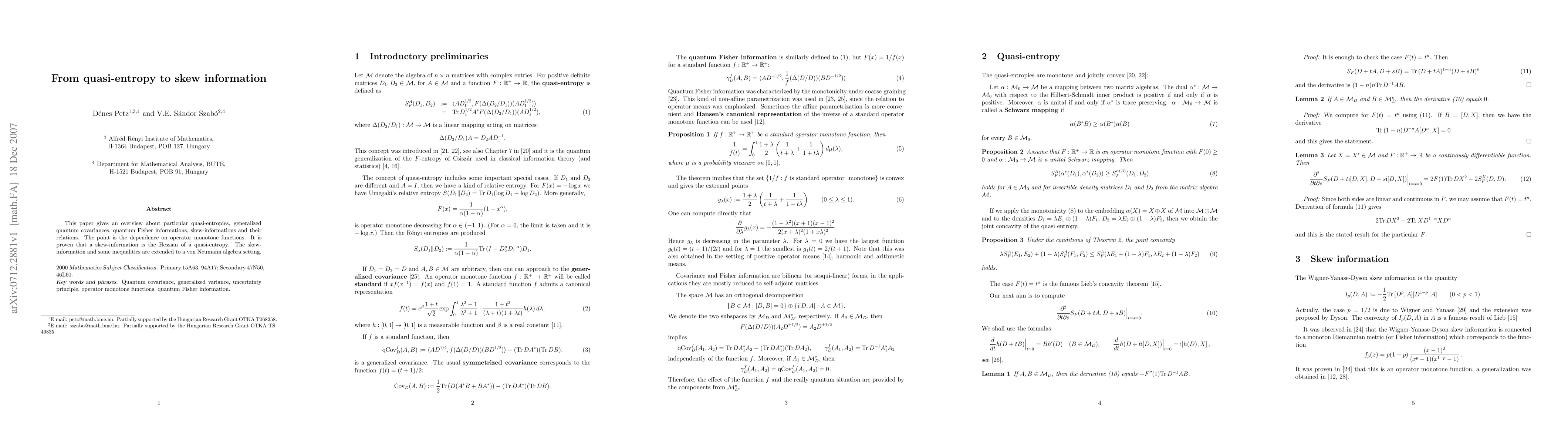 This paper explores quasi-entropies, quantum covariances, and Fisher information, focusing on their operator monotone function dependencies. It proves that skew-information is the Hessian of a quasi-entropy and extends these concepts to von Neumann algebra settings.