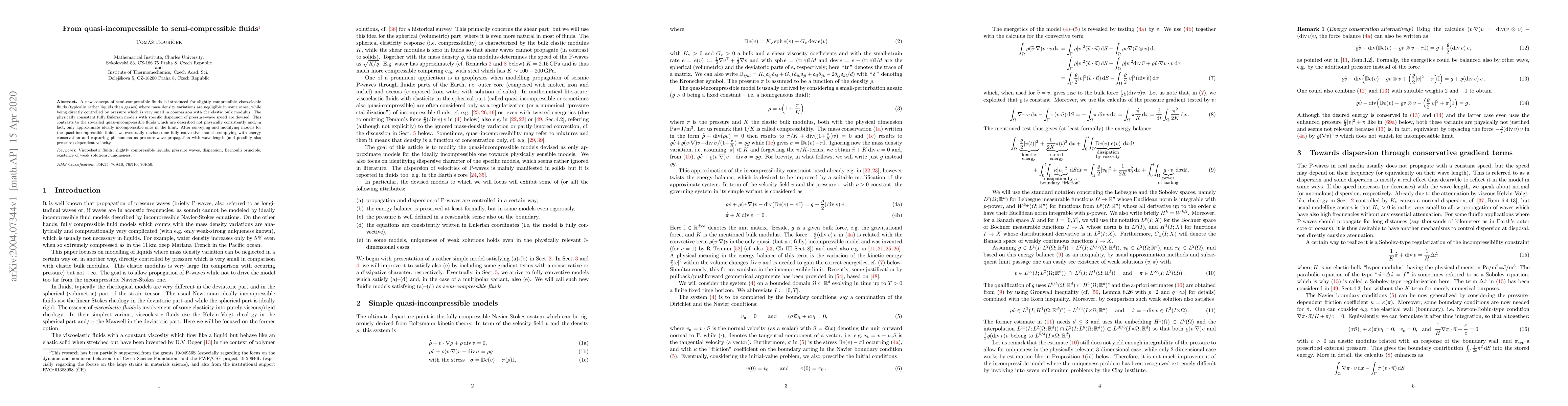 A new concept of semi-compressible fluids is introduced for slightly compressible visco-elastic fluids (typically rather liquids than gasses) where mass density variations are negligible in some sense, while being directly controlled by pressure which is very small in comparison with the elastic bulk modulus. The physically consistent fully Eulerian models with specific dispersion of pressure-wave speed are devised. This contrasts to the so-called quasi-incompressible fluids which are described not physically consistently and, in fact, only approximate ideally incompressible ones in the limit. After surveying and modifying models for the quasi-incompressible fluids, we eventually devise some fully convective models complying with energy conservation and capturing phenomena as pressure-wave propagation with wave-length (and possibly also pressure) dependent velocity.