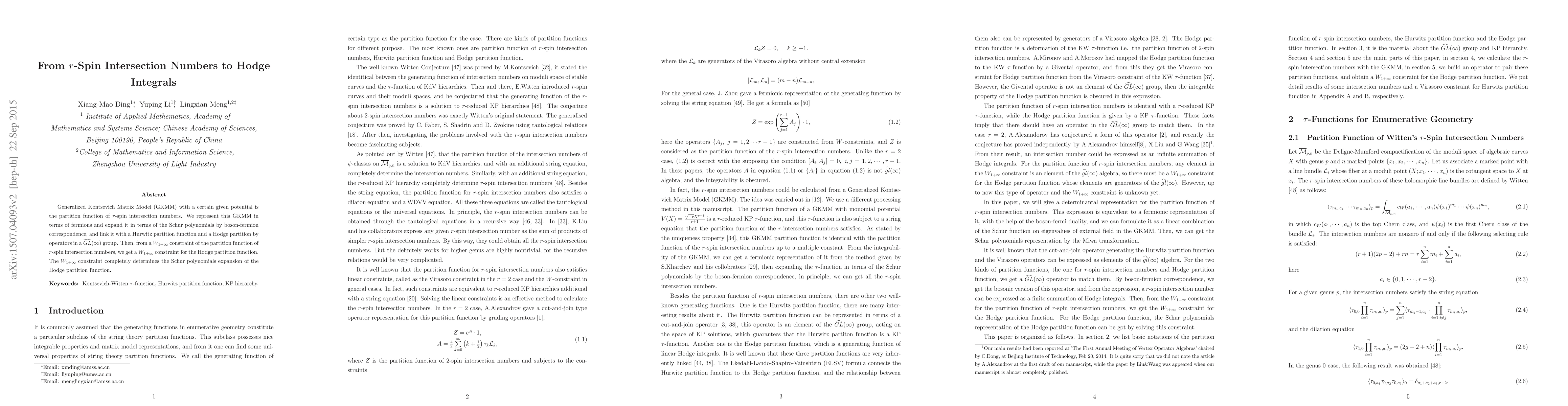 This paper connects the Generalized Kontsevich Matrix Model with $r$-spin intersection numbers to Hodge integrals through a boson-fermion correspondence, linking it to Hurwitz and Hodge partition functions via $\widehat{GL}(\infty)$ group operators. The $W_{1+\infty}$ constraint derived from $r$-spin intersection numbers determines the Schur polynomials expansion of the Hodge partition function.
