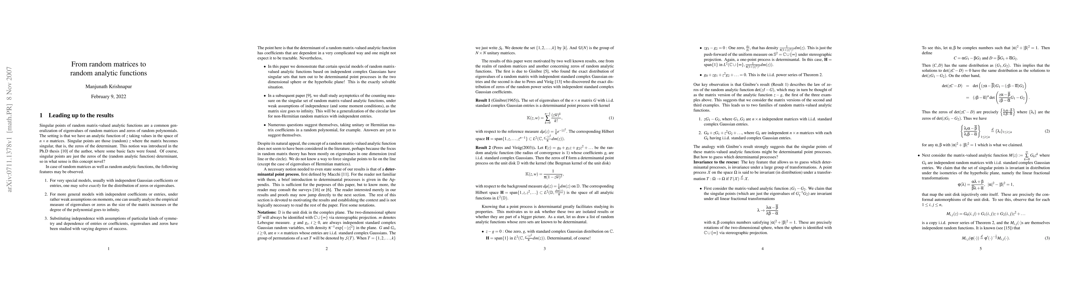 We consider two families of random matrix-valued analytic functions: (1) G_1-zG_2 and (2) G_0 + zG_1 +z^2G_2+ ..., where G_i are n x n independent random matrices with independent standard complex Gaussian entries. The set of z where these matrix-valued analytic functions become singular, are shown to be determinantal point processes on the sphere and the hyperbolic plane, respectively. The kernels of these determinantal processes are reproducing kernels of certain natural Hilbert spaces of analytic functions on the corresponding surfaces. This gives a unified framework in which to view a result of Peres and Virag (n=1 in the second setting) and a well known theorem of Ginibre on Gaussian random matrices (which may be viewed as an analogue of our results in the whole plane).