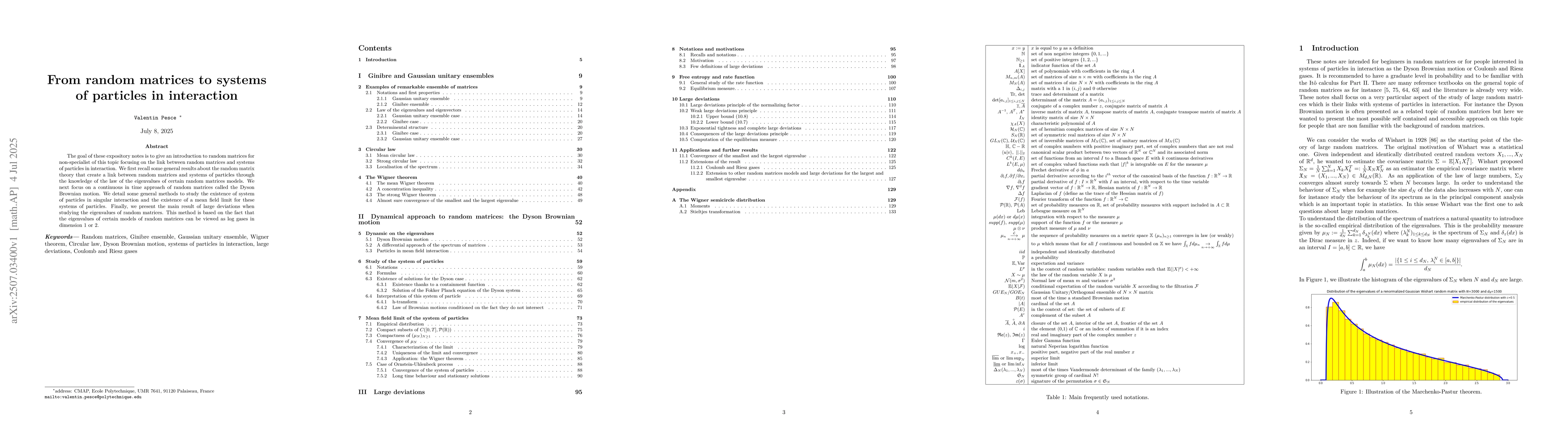 The goal of these expository notes is to give an introduction to random matrices for non-specialist of this topic focusing on the link between random matrices and systems of particles in interaction. We first recall some general results about the random matrix theory that create a link between random matrices and systems of particles through the knowledge of the law of the eigenvalues of certain random matrices models. We next focus on a continuous in time approach of random matrices called the Dyson Brownian motion. We detail some general methods to study the existence of system of particles in singular interaction and the existence of a mean field limit for these systems of particles. Finally, we present the main result of large deviations when studying the eigenvalues of random matrices. This method is based on the fact that the eigenvalues of certain models of random matrices can be viewed as log gases in dimension 1 or 2.
