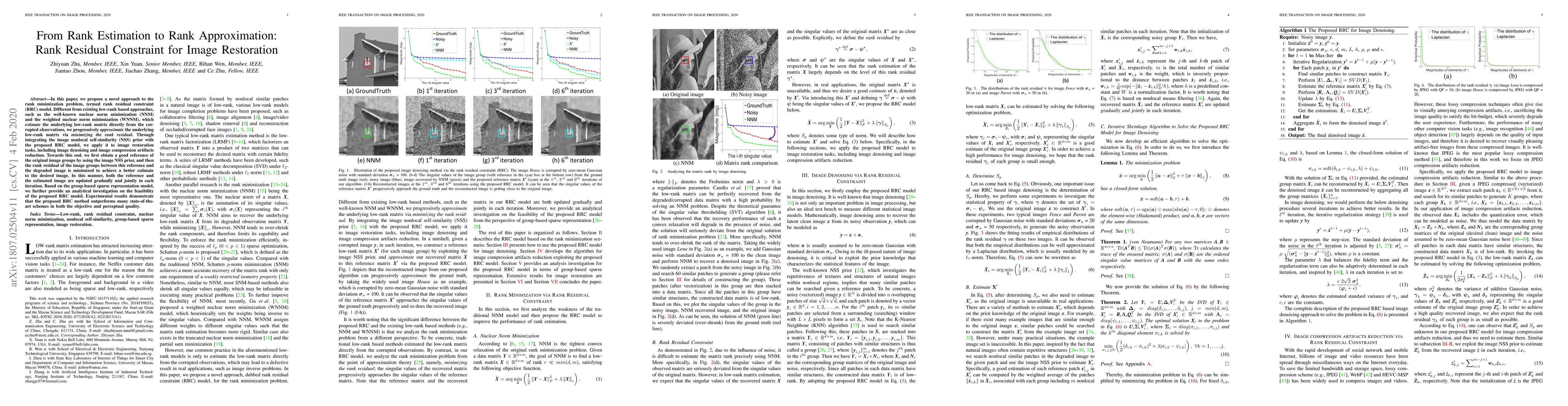 This paper introduces a novel rank residual constraint (RRC) model for rank minimization, which progressively approximates low-rank matrices by minimizing rank residuals. It integrates image nonlocal self-similarity priors to enhance image restoration tasks, achieving superior performance over existing methods.