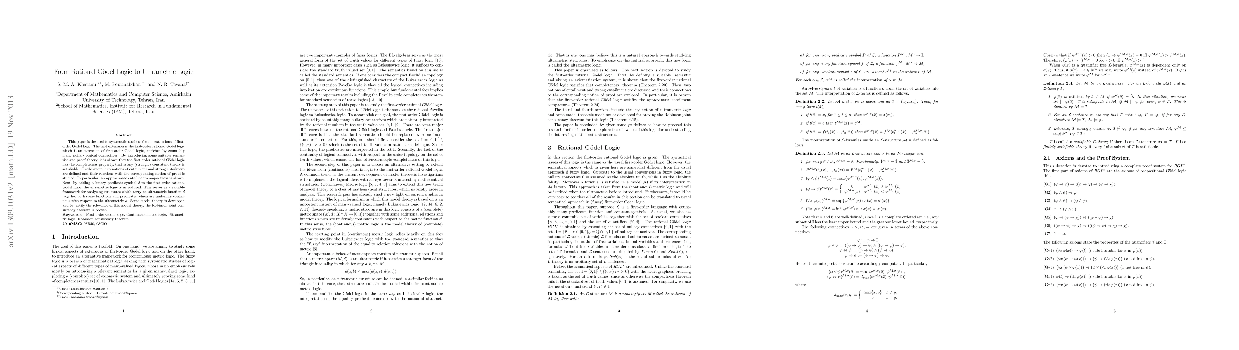This paper introduces a new logic called first-order rational Godel logic, which adds countably many nullary logical connectives to first-order Godel logic, demonstrating completeness and entailment properties. It also develops a framework for analyzing structures with an ultrametric function, proving the Robinson joint consistency theorem.