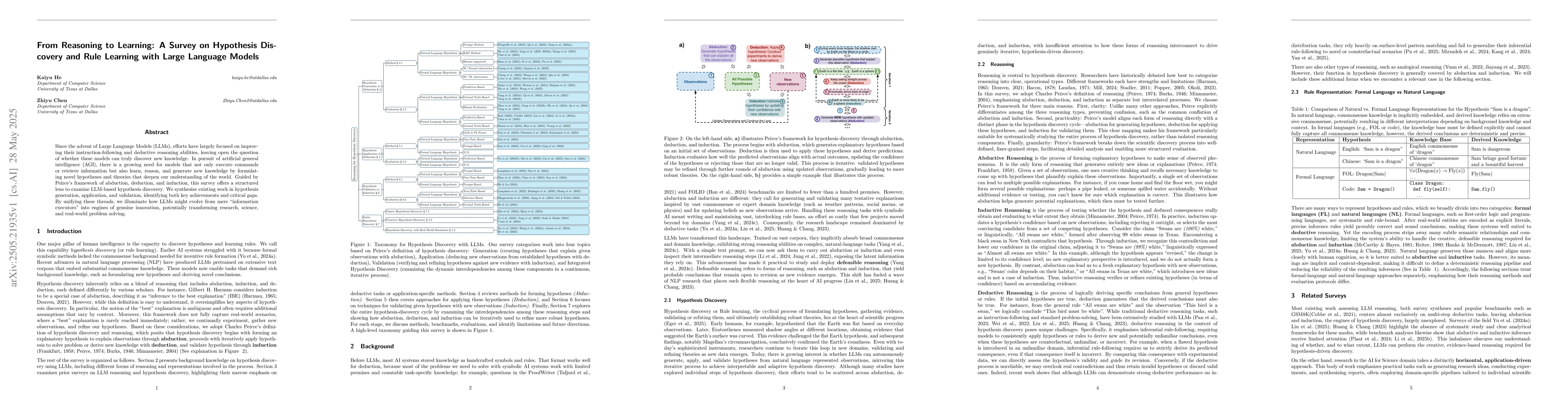 This survey offers a comprehensive examination of hypothesis discovery with LLMs, distinguishing itself by employing Peirce's framework and identifying both achievements and gaps in the field.