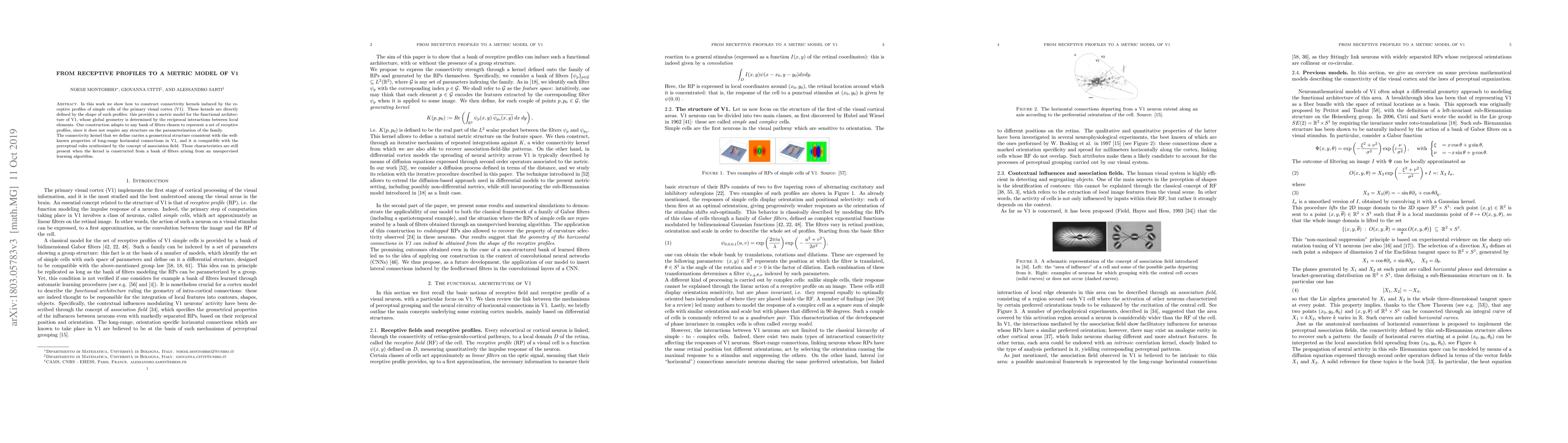 This paper develops a metric model for the functional architecture of V1 based on the receptive profiles of simple cells, constructing connectivity kernels that reflect the geometric structure of long-range horizontal connections, adaptable to any filter bank, and consistent with association field concepts.