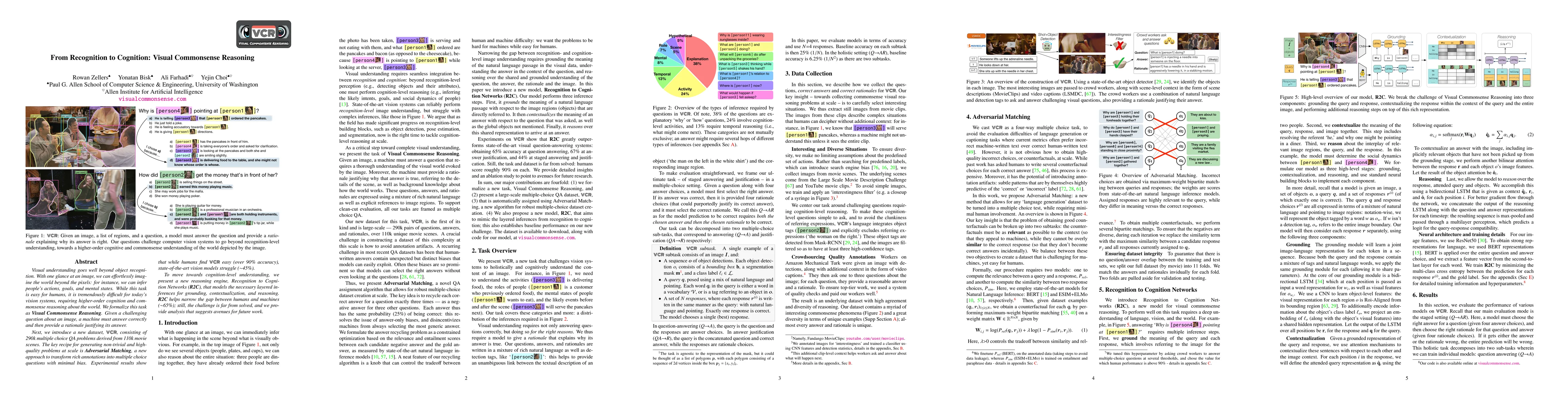 This paper explores Visual Commonsense Reasoning, where machines must infer actions, goals, and mental states from images, a task requiring higher-order cognition. The authors introduce the VCR dataset, which poses 290k multiple choice questions derived from movie scenes, and present Recognition to Cognition Networks (R2C) to improve machine performance, achieving ~65% accuracy and highlighting the need for further research.